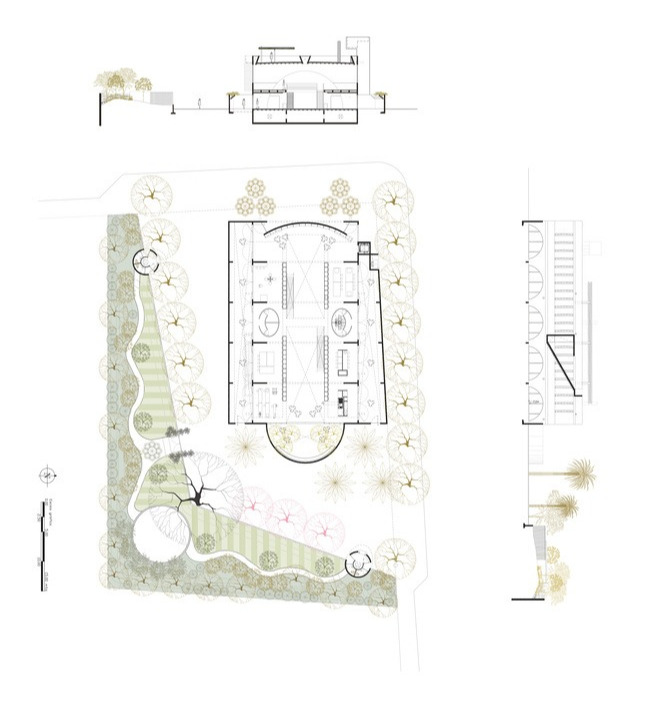 마지막으로 1층 입구 옆에 문을 열고 나가면 반원형 평면의 정원이 계획되어 있다. 문화센터에서 수업을 듣다가 잠시 쉬고 싶을 때 나와서 휴식을 취할 수 있는 공간이었다. 문을 닫으면 벽으로 둘러싸여 식물과 하늘만 마주하는 공간이다. 칼라치의 건물에서 옥상 정원이 없다 보니 의구심이 들었는데, 이곳에 작게나마 정원을 만들어놓았다. 역시나 그에게 건축과 조경(정원)은 뗄 수 없는 요소인 것 같았다.
