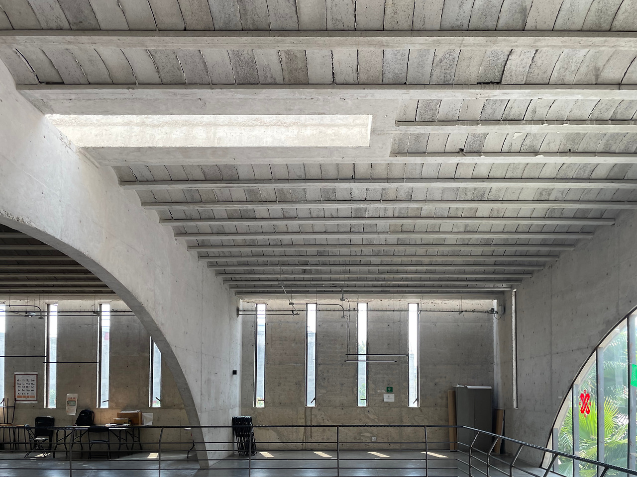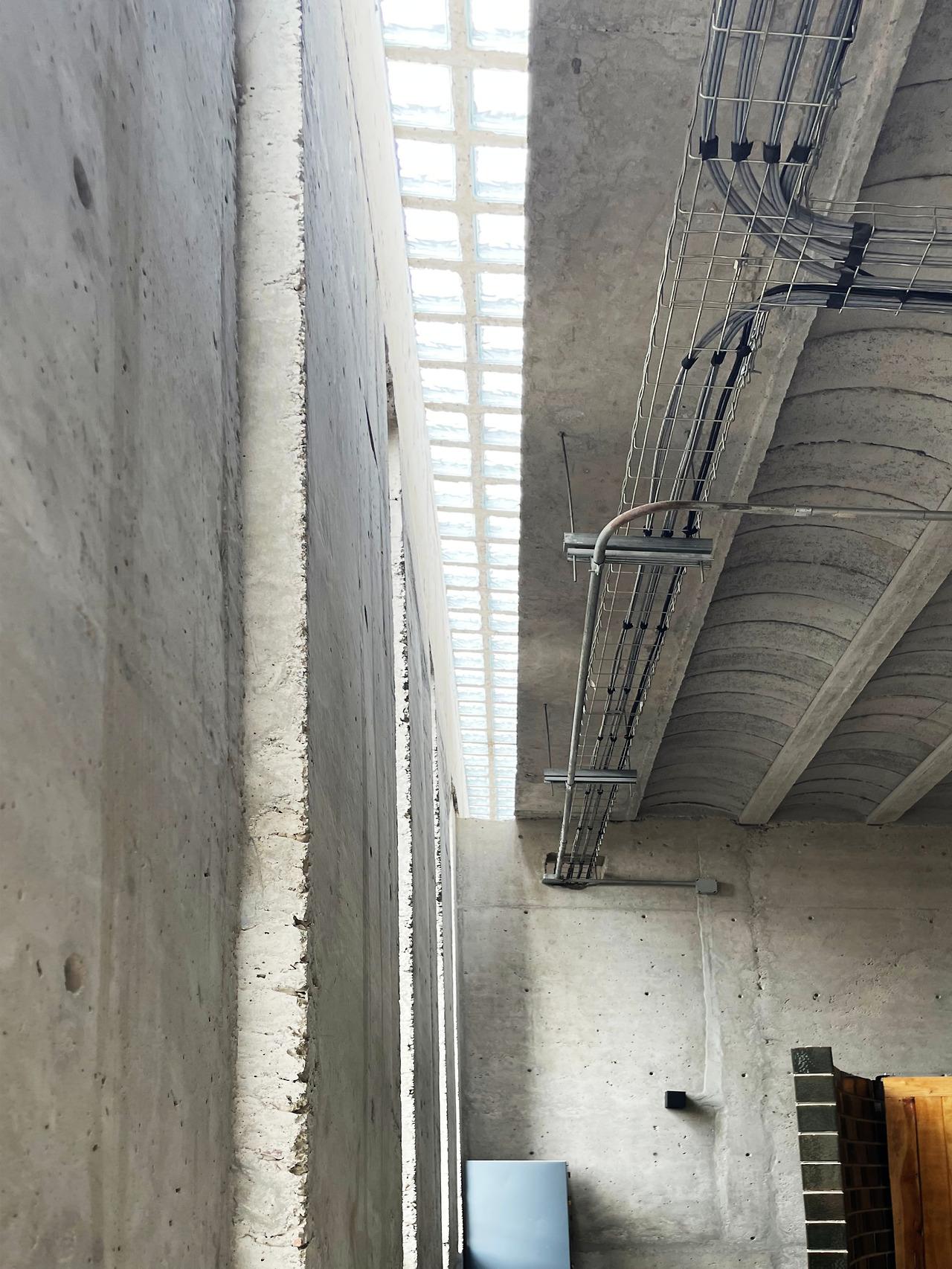 정문 진입 후 90도 꺾어 반원형 입구를 지나 건물 내부로 진입하였다. 내부로 카운터를 지나니 작품집에서 보았던, 반원이 여러 레이어로 중첩된 핵심 공간이 나타났다. 반원형태로 뚫린 콘크리트는 구조 역할을 담당하는 동시에 레이어를 통한 깊이감을 주며 독특한 홀 공간을 구성하였다. 이 공간은 칼라치의 특징을 극명하게 보여주고 있었다. 그의 건물에서 구조는 건물을 지지하는 것을 넘어서 공간을 구성하는 핵심 요소로 작동하고 있었다. 이 공간은 마치 중세 건물의 아치가 중첩되어 있는 모습과 유사하지만, 콘크리트 재료로 지어졌다는 점에서 그 차이를 느낄 수 있었다. 특히 콘크리트가 보역할을 담당하여 벽돌건물과 달리 그 위쪽으로 천창을 만들었다는 점에서 큰 차이를 느낄 수 있었습니다. 이처럼 건물을 지탱하고, 독특한 홀을 만들어내며 평면 분할을 하는 데에도 활용하고 있는 다층적인 구조가 무척 인상적이었다.
