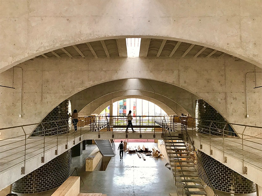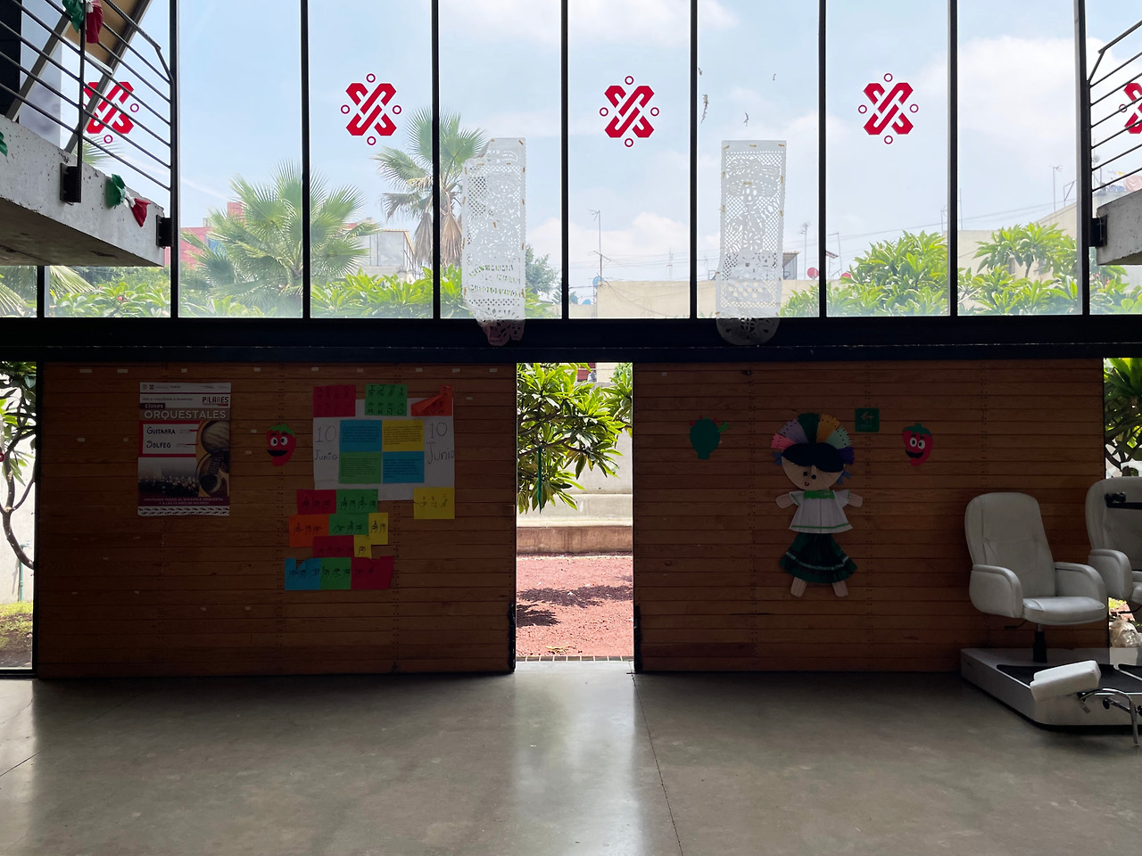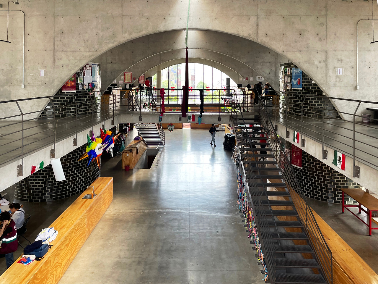 한동안 중앙 홀에 홀려 시간을 보내다가 다시 주변으로 관심을 돌렸다. 반원이 뚫려있는 벽의 기둥 부분은 공간을 분할하는 파티션이기도 했다. 그리고 각 모듈 공간은 반원 창이 계획되었다. 정문을 통해 들어올 때 보았던, 스치듯 지나친 마당은 내부공간과 연계되어 공간 확장이 가능한 가변적인 외부 공간이었다. 처음 진입하는 과정에서 외부 담이 반원형 입면을 가리고 있어서 아쉽다고 했지만, 내부 공간이 어떻게 활용되고 있는지를 보며 그 의도를 알게 되었다. 그리고 건축가의 의도대로 각 모듈 공간은 여러 활동이 이루어지는 강의실이었다. 방문할 당시에 그래픽 디자인, 요리 수업과 바느질 수업이 이루어지고 있었다. 그리고 평일에는 어린이를 위한 문화활동이 많이 이루어진다고 하였다. 독립 기념일이 지난 지 얼마 되지 않아 아이들이 만든 종이 접기와 바느질 수업의 창작물이 슬라브와 벽 이곳저곳에 붙어있었다. 건축가가 의도한 대로 유지되는 순수한 공간을 보는 것도 좋지만, 건물이 그 용도에 맞게 잘 활용되고 있는 모습은 또 다른 즐거움이었다.