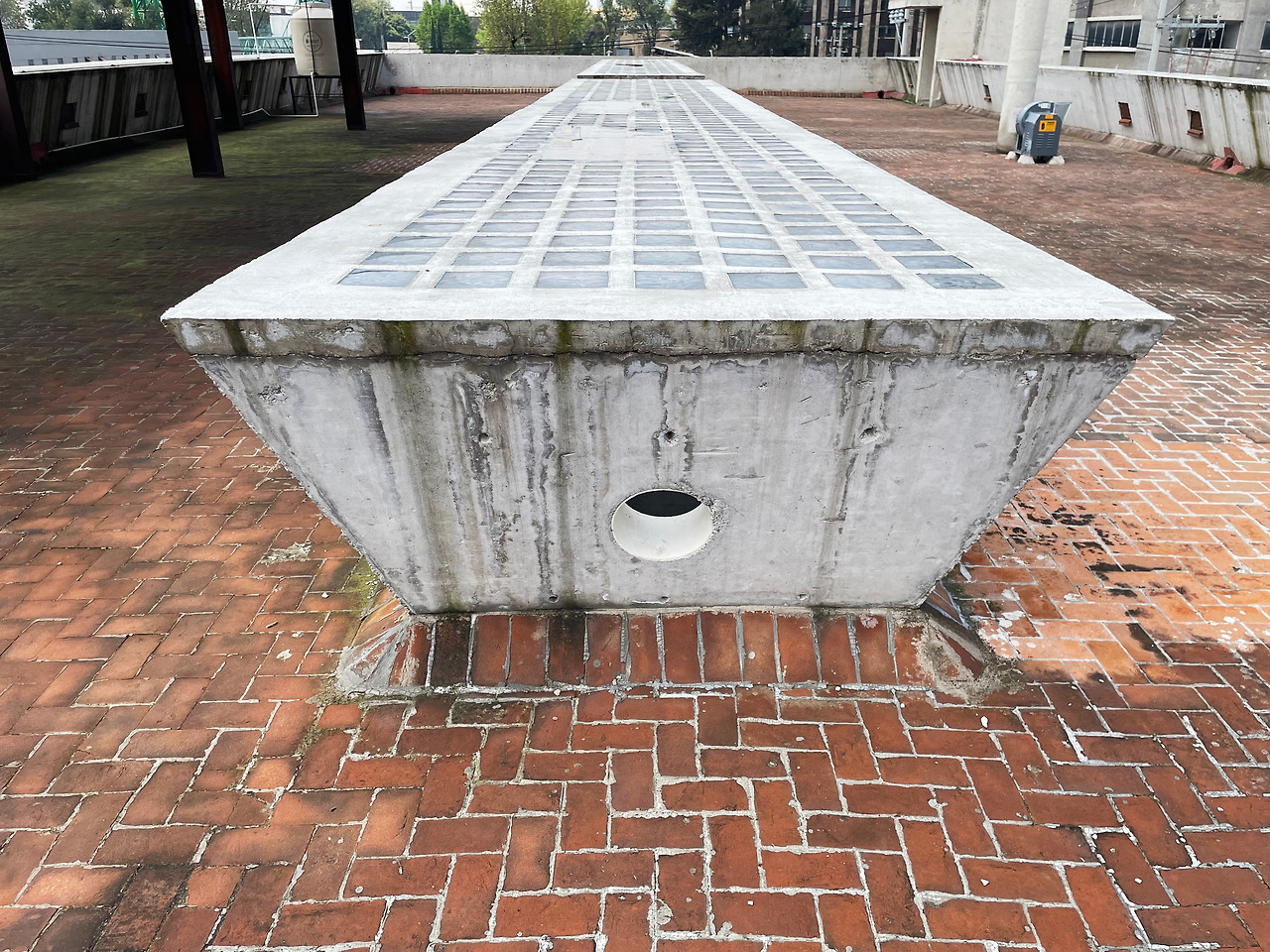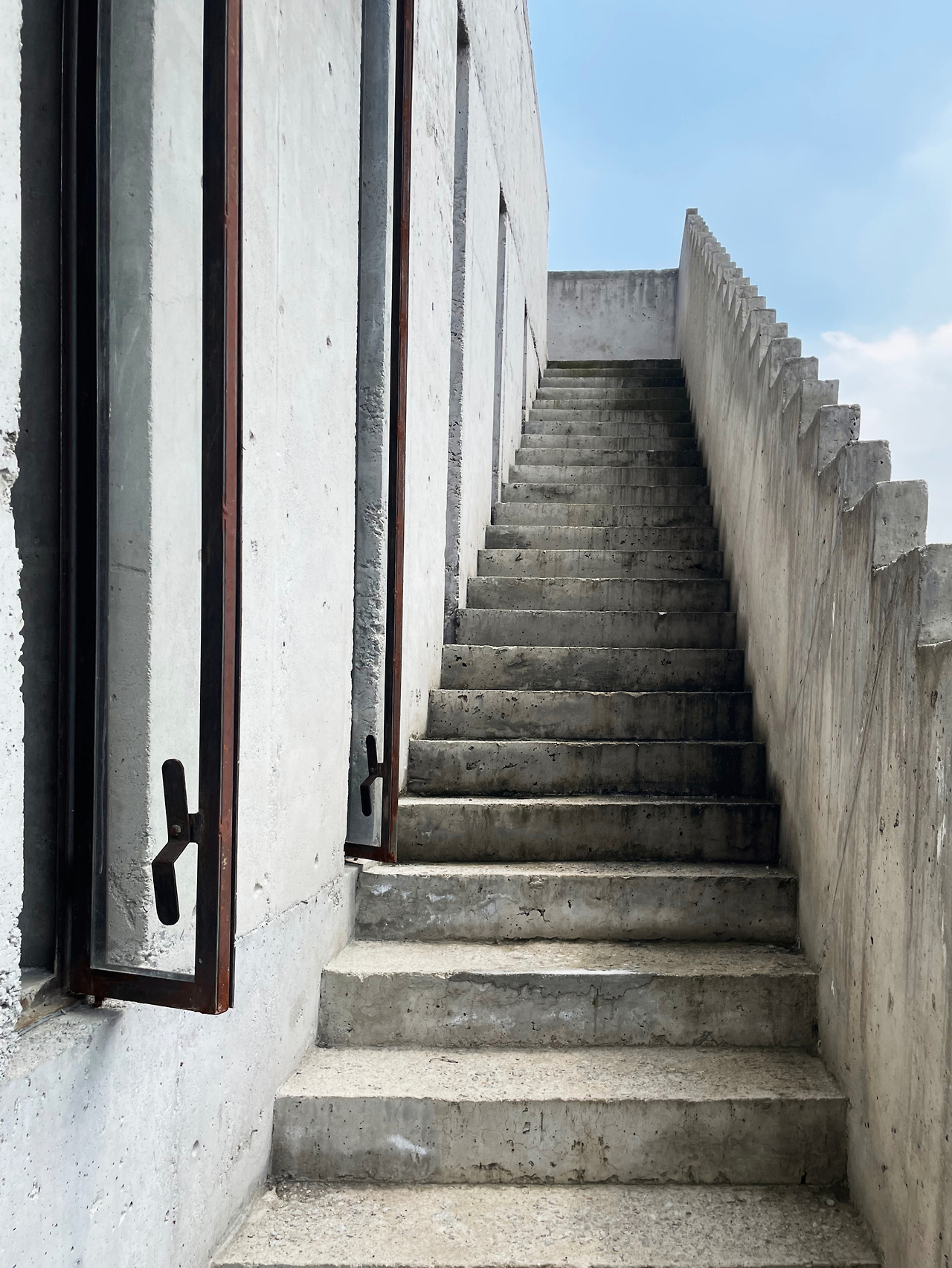 그렇게 1층과 2층을 돌아보고, 외부 계단을 따라 옥상으로 올라갔다. 옥상에 정원이 계획되어있지 않을까 하는 추측과 달리 텅 빈 공간이었다. 먼저 눈에 들어온 부분은 천창이 계획되어 있는 부분이 꽤 높이 디자인되어 가드레일 및 파라펫 역할도 담당하고 있었다. 역시나 건축 요소의 디자인이 개별적으로 고려되지 않고 통합되어 다층적인 디자인을 제안하는 상상력이 칼라치의 가장 독창적인 면모라는 생각이 들었다. 다만 바깥쪽은 건물 외벽을 따라 수직으로 서있지만, 안쪽은 사선 형태로 디자인되어서인지 물때가 아주 많이 껴있었다. 이 부분을 어떻게 처리해야 했는지 궁금해지는 지점이었다. 이후 특별한 점이 없어서 간단하게 옥상을 돌아보고 다시 1층으로 이동하였다.