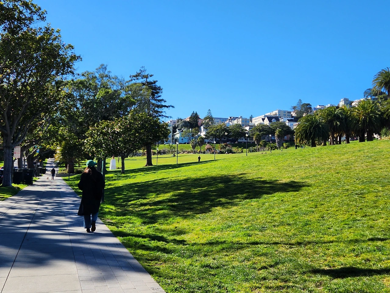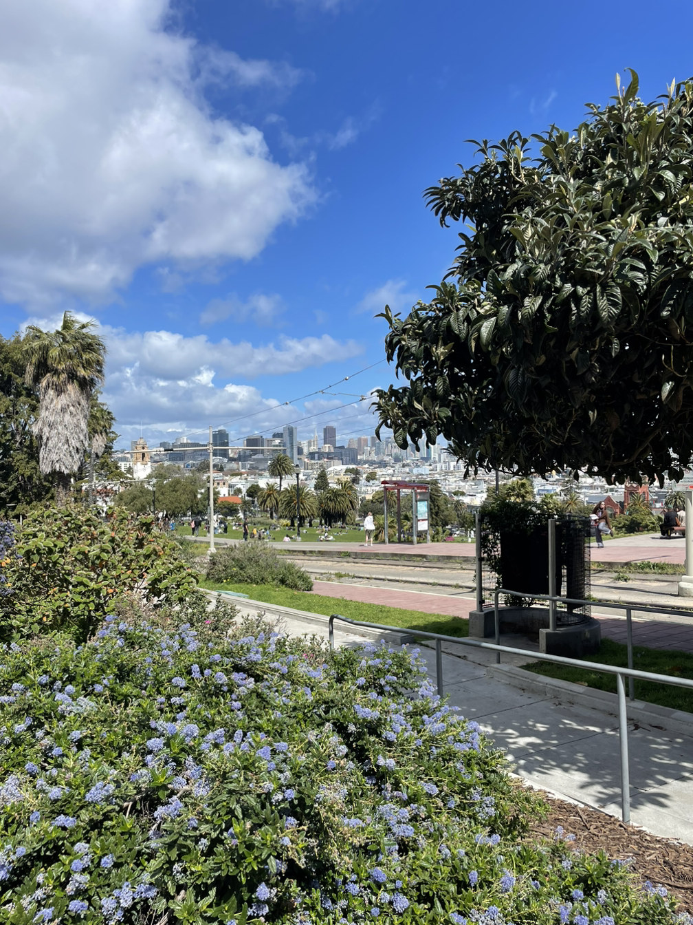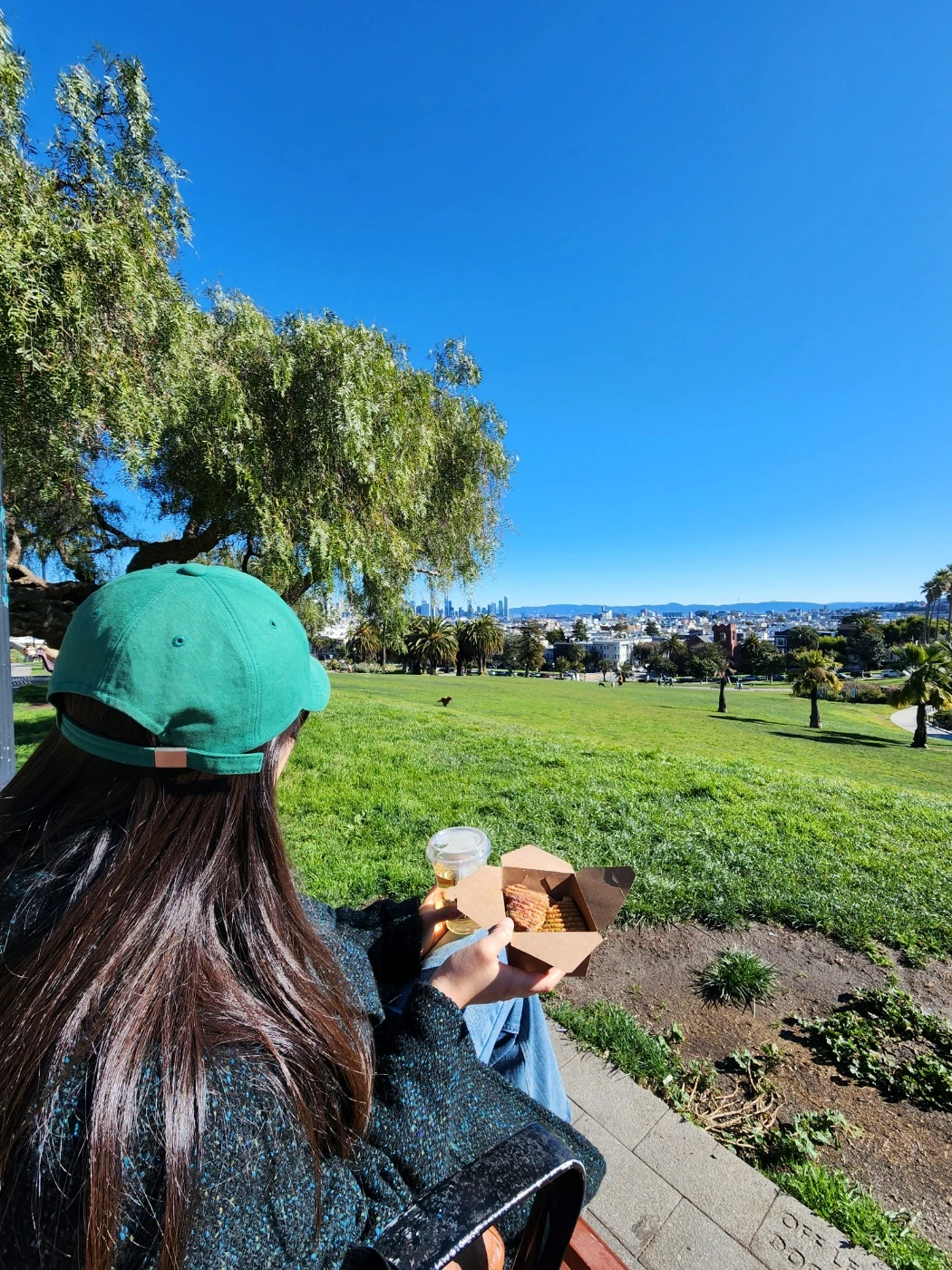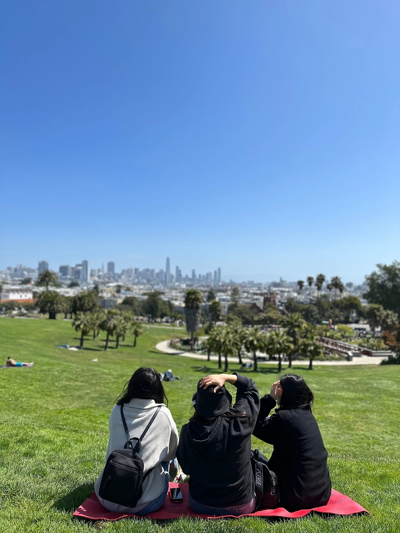 작년 5월, 나의 동생들도 샌프란을 찾았다. 그들이 이야기하는 최고의 장소 역시 돌로레스였다. 이번에도 역시 샌프란의 전경이 다 내려다보이는 북쪽 끝에 앉아 햇볕을 등지고 경치를 바라보았다. 빨간색 요가매트를 잔디 밭에 깔았다. 별 말 하지 않아도 그렇게 머무르고만 있어도 마음이 치유되는 느낌이었다. ‘우리 셋이 이렇게. 같은 곳을 바라보고 있구나.’하는 생각에 괜히 마음이 뭉클했다. 하늘은 짙게 푸르렀고 멀리 도심의 스카이라인도 보였다.