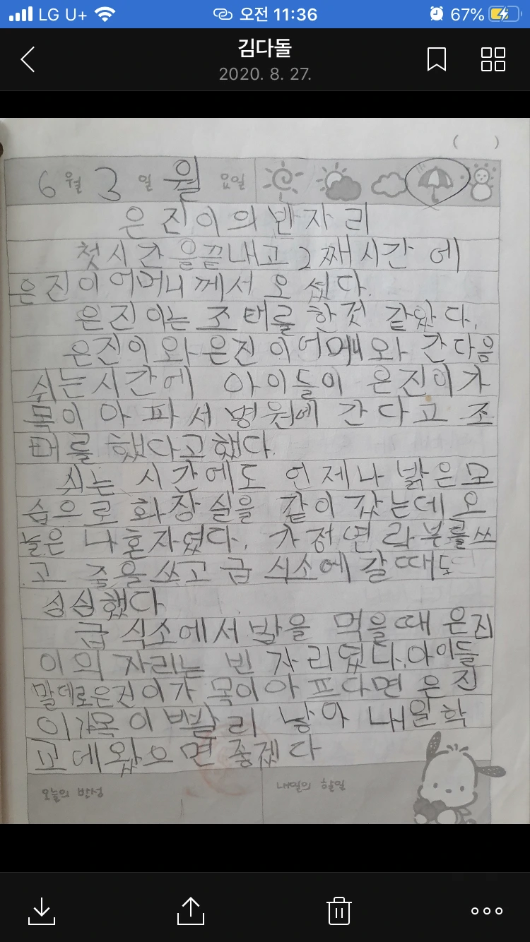 어느 날 다돌이가 자신이 초등학교 2학년 때 쓴 일기를 찍어 보냈다. 내가 아파서 조퇴했는데, 자신도 걱정이 되었다는 내용이었다. 나는 기억하지 못하는 어떤 하루가 그 애의 일기장에 적혀 있었다. 우리는 과거를 나눈 사이다. 쏭은 초등학교 5학년때 만든 문예집 ‘영화신문’을 찍어 보냈다. 우리 셋이 쓴 운문과 산문들이 놓여있었다. 그때도 꽤나 글솜씨가 좋았던 우리 셋의 글이 날긋날긋한 종이에 찍혀 있는 것을 보니 재미있었다. 그때의 기억은 잘 나지 않는데도 우리가 보낸 날들이 누군가 일기와, 편지에 기록으로 남아 있는 것이 참 좋다.