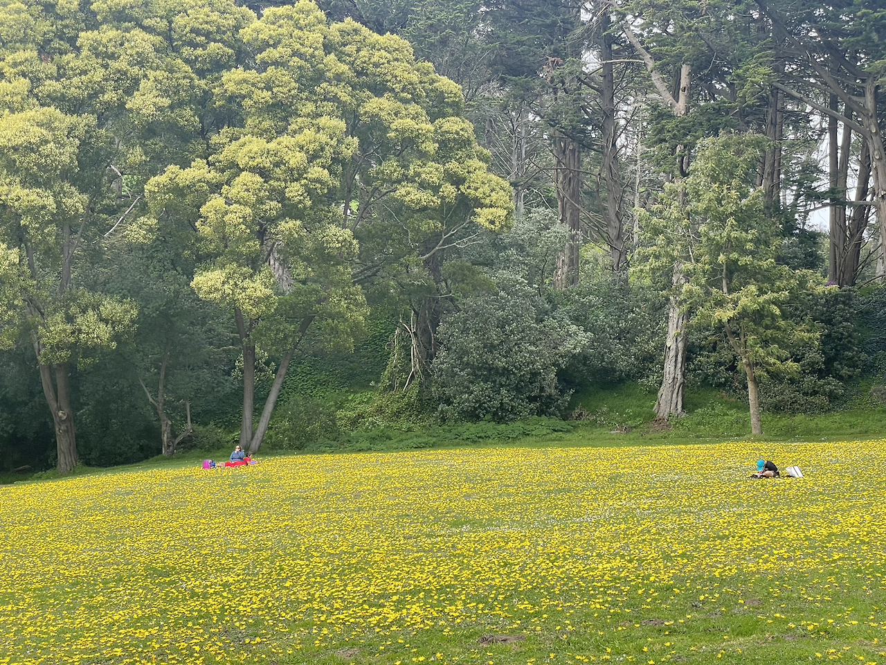 스트로베리 힐 옆에는 마더스 미도우(Mothers Meadow)가 있다. 엄마의 들판이라니 이보다 이 장소를 더 잘 설명할 수 없을 정도로 기가 막힌 이름이다. 엄마처럼 우리를 품어 줄 것 같은 아늑한 들판이 계절마다 다른 색으로 펼쳐진다. 4월의 마더스 미도우는 노란 야생화가 수를 놓았다. 너무 예뻐서 그냥 지나칠 수가 없다. 얼른 그곳 한가운데 누워 풍경의 일부가 되어야 했기에 트렁크에 항상 넣어 다니는 돗자리를 깔고 누워 하늘을 바라보았다. 노오란 융단 위의 파란 하늘, 그사이에 나. 이 순간만큼은 돗자리가 마법의 양탄자가 된 기분이다.