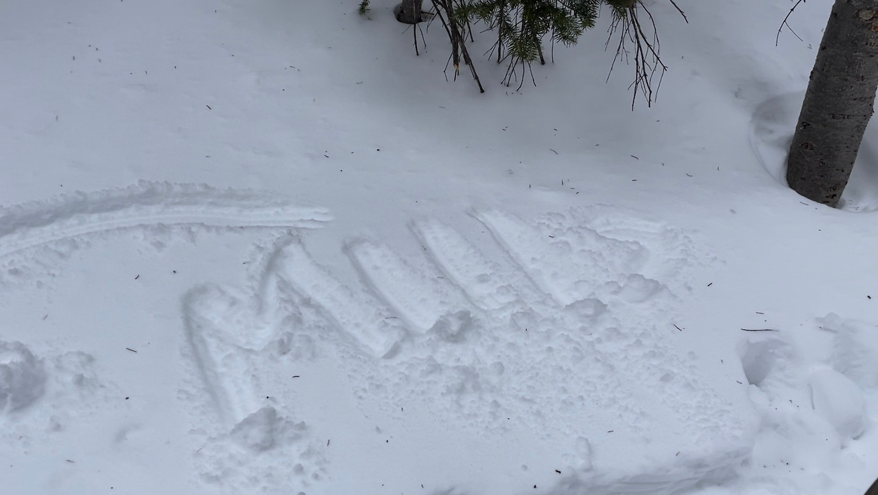 힝구는 우리가 놓쳤던 헷갈리는 갈림길에서 사람들이 길을 찾기 쉽도록 눈 위에 화살표를 그려 이정표를 만들었습니다. 주차장으로 돌아가는 길에 마주친 사람들이 길을 물어보자 갈림길에서 화살표 방향을 따라가라고 알려주었죠.