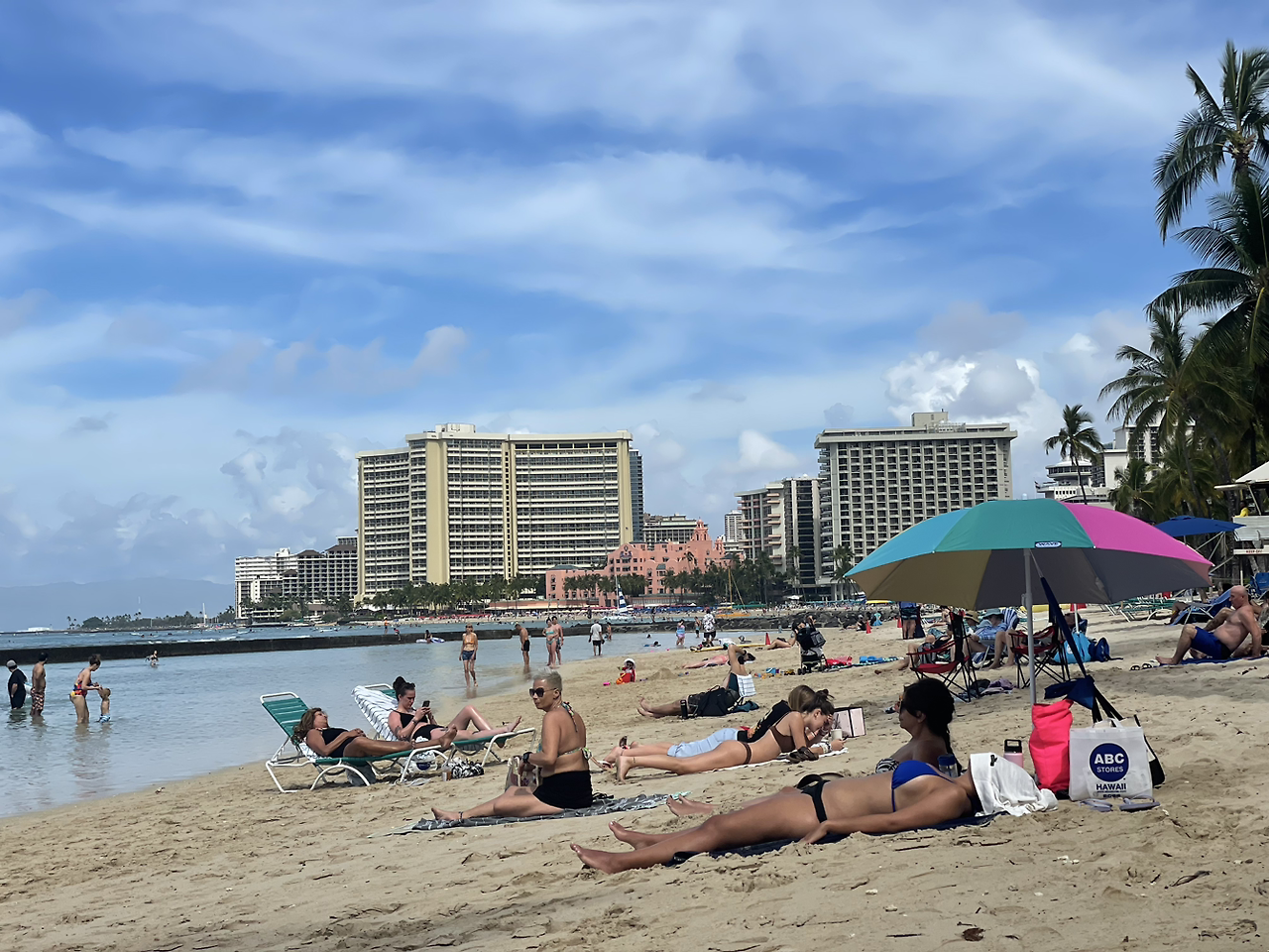 그렇게 내 인생 두 번째 하와이 여행이 시작되었다. 숙소는 의도치 않았지만 지난번 간 에어 bnb와 같은 건물인 ‘선셋 와이키키’였다. 와이키키 해변에서 도보 4분 정도 걸리는 이 건물은 오래되었지만 잘 관리된 호텔 겸 콘도다. 저 멀리 건물들 사이로 해변이 보이는 나름 오션뷰 숙소에는 서핑보드와, 비치 체어가 놓여있었다. 하와이를 맘껏 누리라는 주인장의 배려가 넘치는 집이었다. 같은 건물에 두 번이나 오니, 부자들이 와이키키에 여름 콘도를 하나 만들어 놓으면 이런 느낌이겠구나 했다.