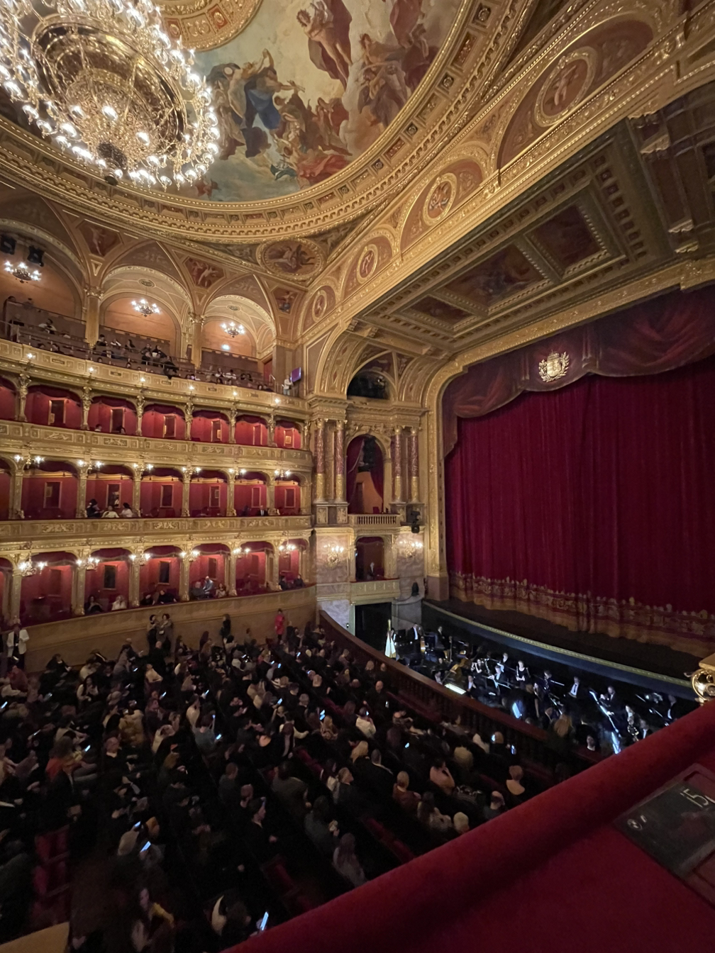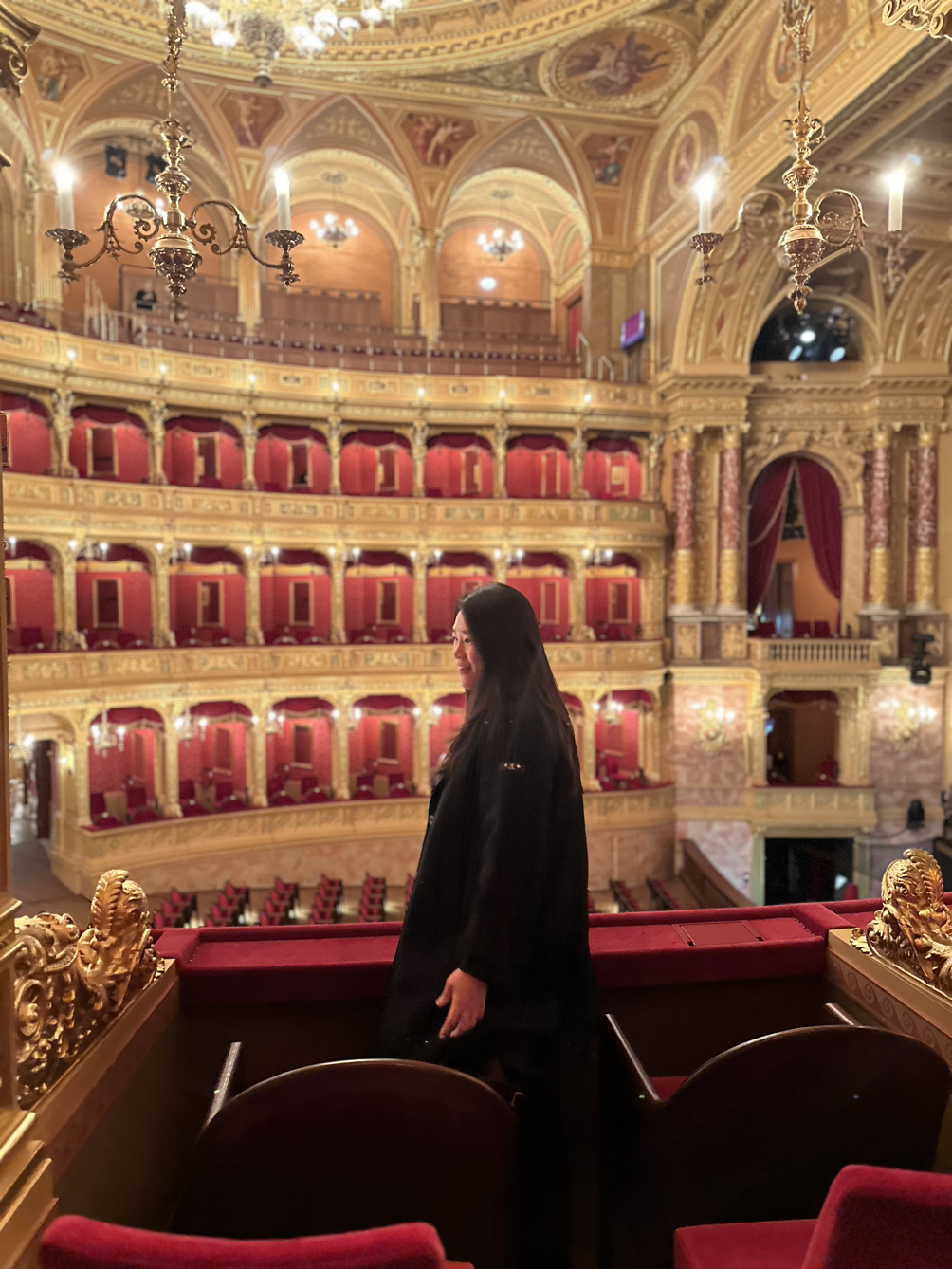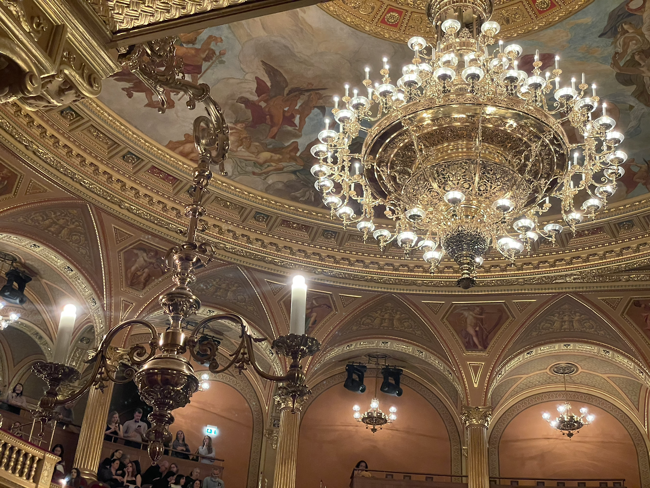 약간은 후줄근한 차림으로 오페라 하우스에 도착했을 땐, 빨간색 사틴 원피스를 입은 안내직원들이 우리를 발코니석으로 인도했다. 차림새 때문에 자격 없는 이들이 대접을 받는 것 같아 쭈뼜거렸지만 기분은 좋았다. 170달러를 주고 산 5번 방의 문을 열자 등받이와 앉는 곳이 빨간색 벨벳으로 이루어진 황금색 의자 2개와 보조의자 2개가 놓여있었다. 테라스 가까이에 다가가니 연하늘색 바탕에 통통한 아기천사들과 나체의 남녀들이 두둥실 떠다니는 천장화 아래로 은은한 주황색 조명을 반사하는 크리스탈 샹들리에가 눈이 부셨다.