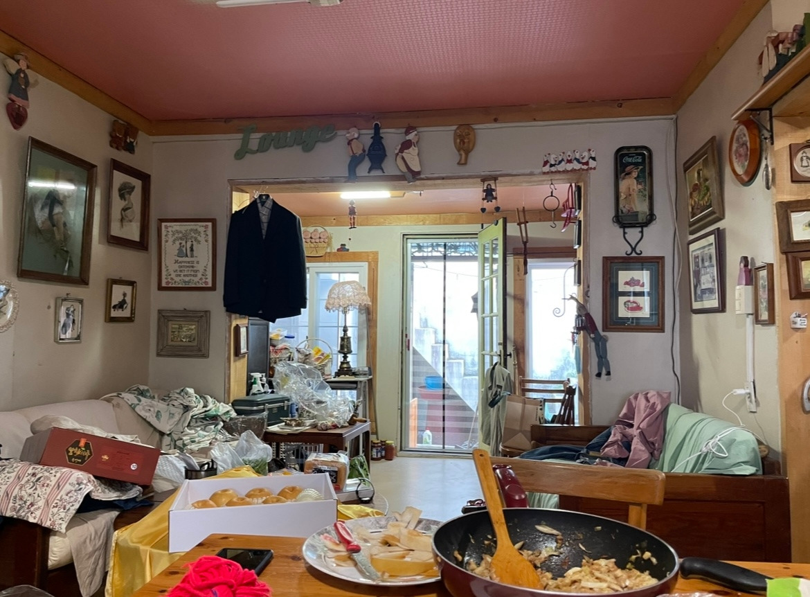 교회주차장 옆 높은 회색 시멘트벽이 집의 가장 긴 옆면을 이루는 허름한 주택은 가파른 비탈길 쪽으로 대문이 나있었다. 허나 그 대문은 잡초더미로 막혀있어 옆에 나있는 알루미늄 쪽문이 이 집을 드나드는 주요 출입구였다. 나는 독특한 구조의 허름한 그 집이 힙 한 카페가 될 수 있는 재목임을 알아봤지만 그 집이 카페가 된다는 건 현실화될 수 없는 일임을 안을 보고 바로 확인할 수 있었다. 어머님은 한국에서도 미국에서 봤던 모습처럼 부스스한 머리와 세수조차 하지 않은 얼굴로 나를 반기셨다. 집안은 어디서부터 나는지 알 수 없는 쿰쿰한 냄새로 가득했다. 예쁜지 안 예쁜지 구분할 수 없는 각종 물건들이 집안을 빼곡하게 채우고 있었다. 바닥은 신발을 신고 다녀 먼지와 흙이 떨어져 있었다. 화장실은 별도의 문이 없었고, 방이라 불리는 곳에는 침대 위에서부터 천장까지 봉지로 쌓인 알 수 없는 물건들이 테트리스처럼 쌓여있었다.