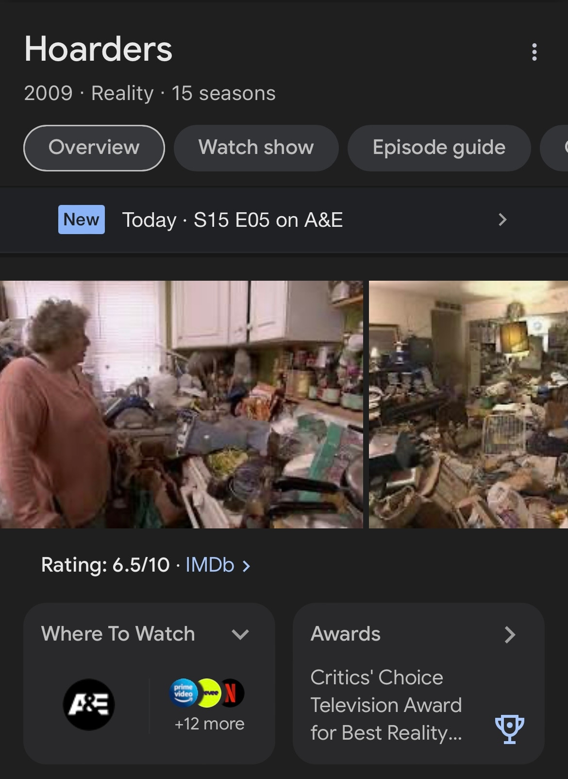 넷플릭스 “Hoarders” 시리즈는 저장 강박 장애를 가진 사람들의 이야기를 다룬다. 이 프로그램을 통해 미국에서는 저장 강박 장애를 가진 사람들과 그들의 삶에 대한 인식이 높아졌다. 대부분의 출연자들은 시어머니처럼 집 안에 물건을 가득 쌓아놓고 살고 있는데, 이들은 트라우마나 과거의 손실로 인해 안전하고 보호받는 느낌을 얻고자 물건을 모으게 된 경우가 많다. 강박적으로 물건을 모으는 행동이 불안과 스트레스를 줄이는 방법으로 사용된 것이다. 대부분의 에피소드는 이들의 물건을 치우면서 끝이 나지만, 완전한 동의나 치료가 없이 이루어진 청소는 환자들에게 큰 충격을 주게 된다. 버려진 물건들에 대한 감정적 결핍으로 분노, 우울함, 무력감 등의 감정이 더해져 강박증 증상이 더 심해지는 것이다.