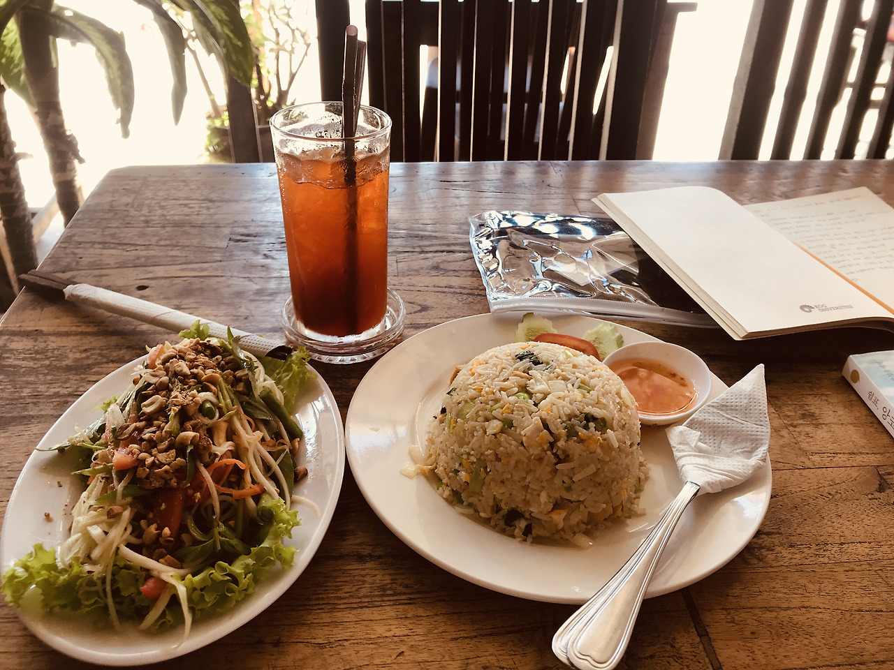 4달러에 그린파파야 샐러드, 두부 볶음밥, 아이스티를 주문했다. 상큼한 야채들의 조화가 울렁거리던 속을 달랬다. 앞으로 펼쳐질 캄보디아에서의 여행이 어떨지 나는 또 이렇게 맨땅에 헤딩하듯 씨엠립을 배회한다.
