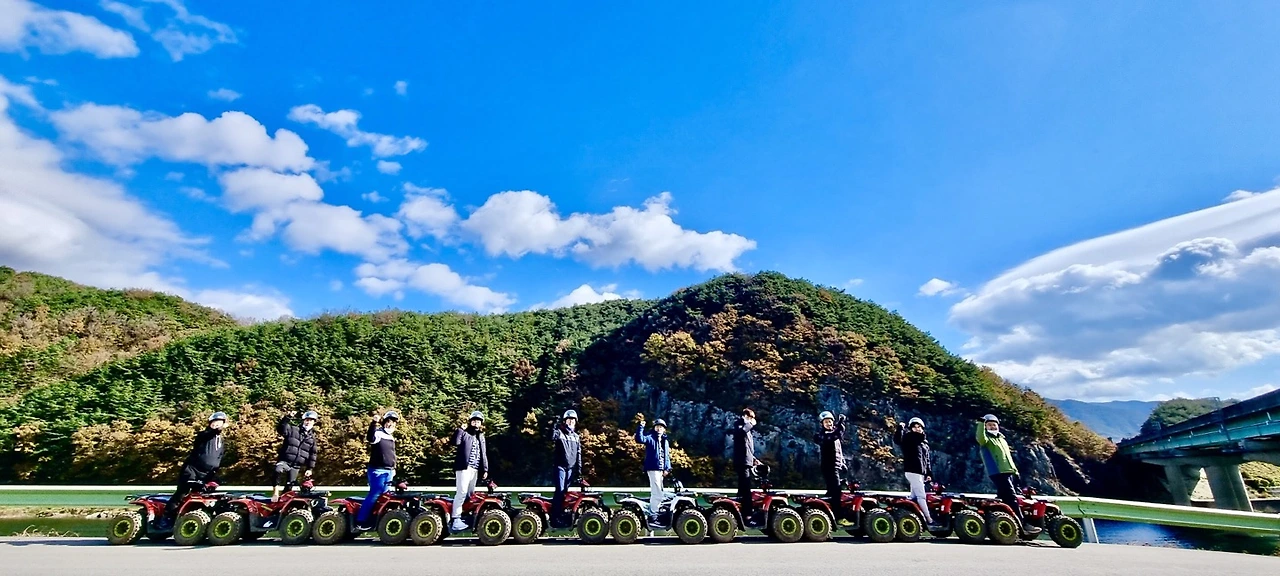 간단한 이론 교육을 받고 시험 운전에 들어갔다. 부릉부릉! 우와! 멋지다. 이 녀석들 완전 레이서 아닌가. 모두 시험운전 평가를 통과하여 인솔자를 따라 달리기 시작한다. 가을걷이가 끝난 논두렁 들판을 지나 옆으로 경호강이 흐르는 시원한 강변길을 달려 각자 최대 속도를 끌어올려 마음껏 밟아보는 코스로! 붕붕붕! 우린 사륜 ATV 부대다.