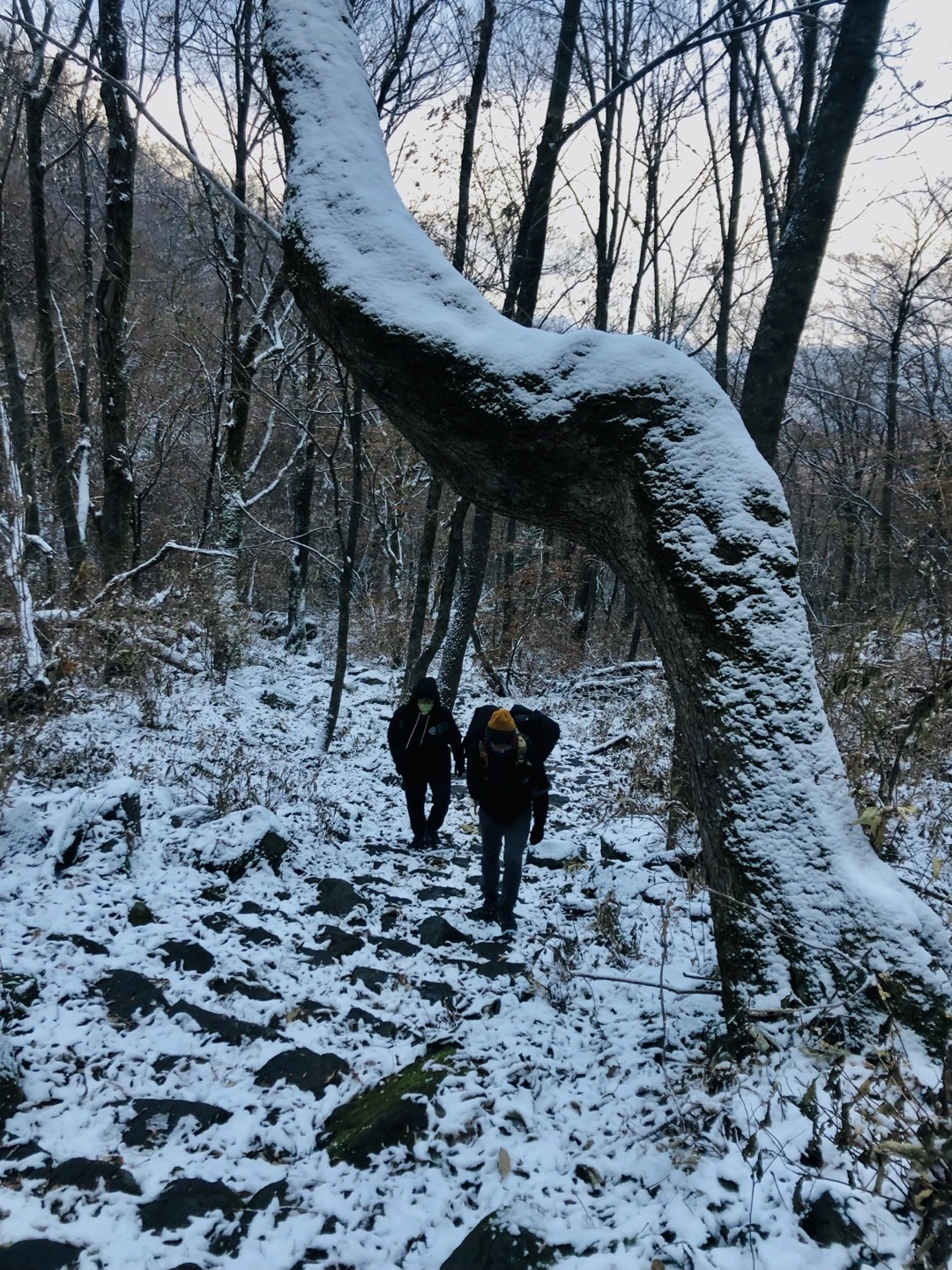 애써 독려하며 함께 걷는다. 걷다 보니 금세 동이 터 온다. 여명의 신비로움과 겨울 깊은 산의 신선함이 가슴을 정화시켜준다. 눈까지 소복이 내린다. 오늘 운이 좋다. 어둠의 길을 지나 단풍 빗길을 걷고 겨울눈 쌓인 고요한 길을 간다. 그런데 경석이가 안 보인다. 이 녀석 천천히 같이 걷자 했더니 벌써 혼자 올라갔나. 꾸역꾸역 가기 싫은 걸음을 내딛는 현태를 앞뒤로 챙기며 한참을 가니, 저만치 위에서 경석이가 웃으며 혼자 말랑카우를 먹으며 웃고 있다. 혹여 경석이가 짜증 낼까 미리 예방주사를 놓는다.