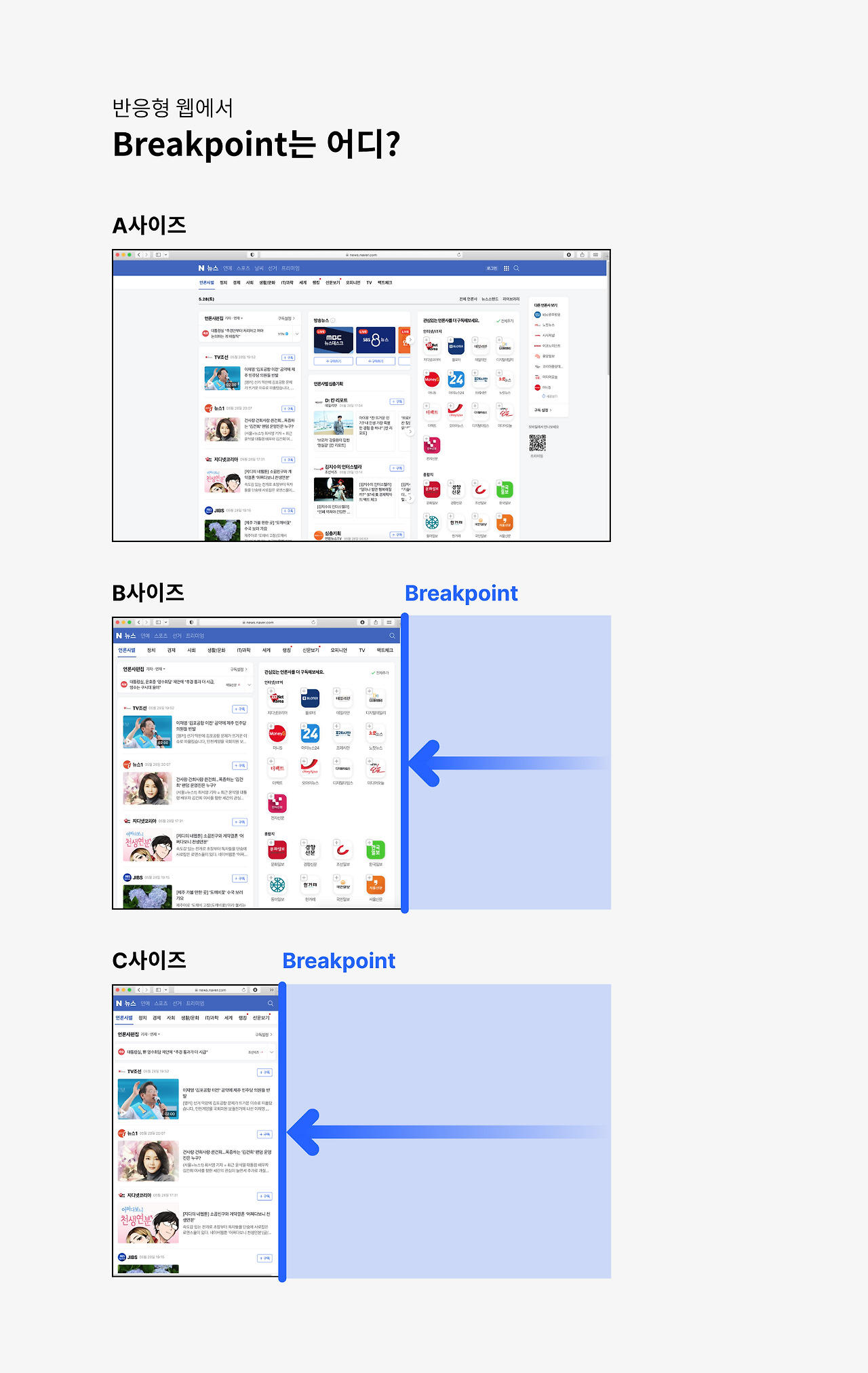 Breakpoint는 말 그대로 무너지는 지점을 말합니다. 반응형 웹에서 UI는 화면 사이즈가 줄어듬에 맞춰서 점점 변해가는 것이 아니라, 특정 사이즈가 되면 두둥! 하고 무너집니다. 여기서 Breakpoint는 두둥! 하는 지점입니다. 예를 들어 “A 사이즈는 사진을 5줄로 보여주고, B 사이즈로 줄어들면 2줄로 보여줘!”라는 코드가 있습니다. A 사이즈~B 사이즈 직전까지는 5줄로 보여주다가, B 사이즈가 되는 순간 2줄로 변하는데 이 지점이 Breakpoint예요.
