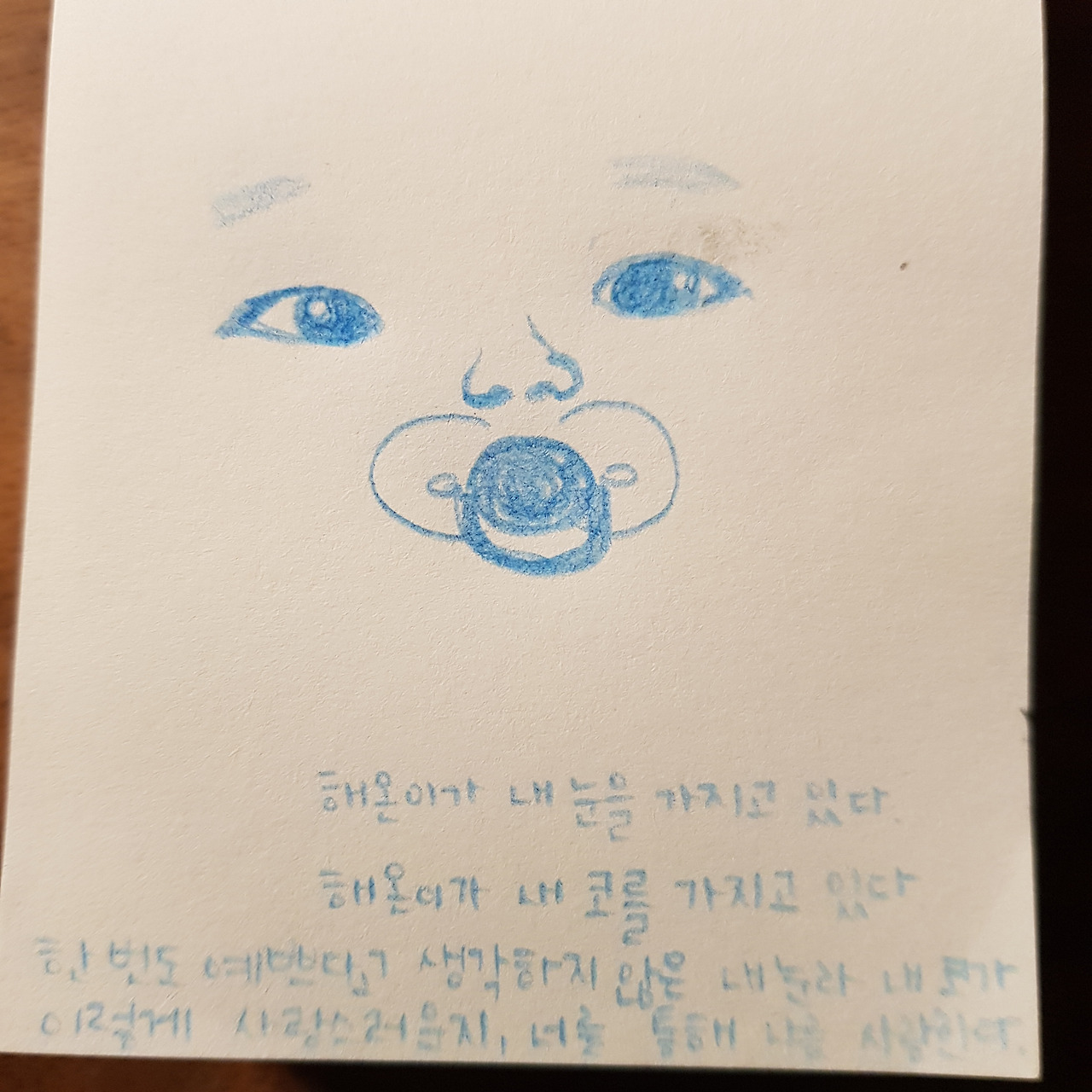 나의 아기 해온이가 나에게 왔다. 갓 낳은 나의 아기를 보았는데 아기가 나와 완전하게도 똑같은 코를 가지고 있었다. 손대면 바스러질 것 같은 나의 아기가 너무 예뻤다. 가지고 태어난 그 모습 그대로 완벽했다. 너무 아름다워 이런 것을 낳은 내가 자랑스러워지기까지 했다.