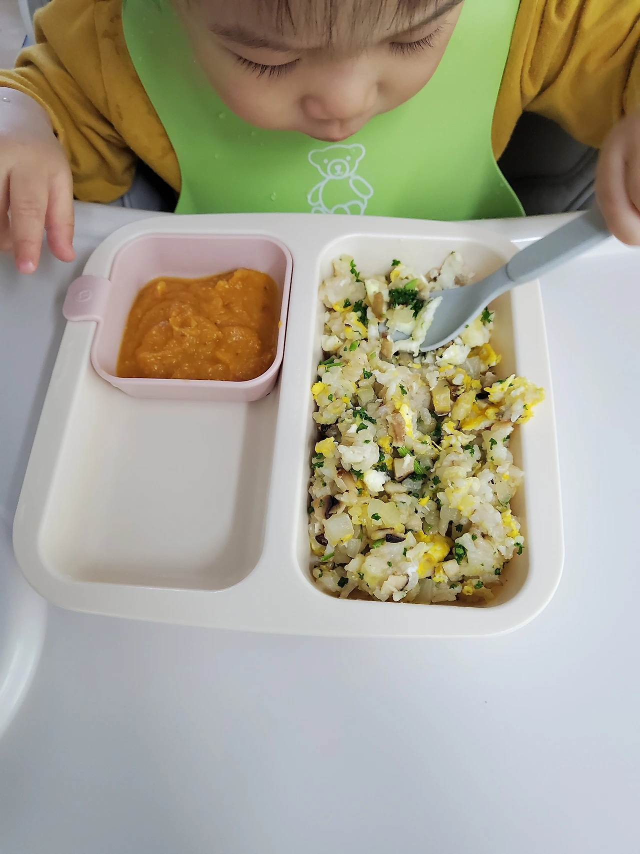 코코넛 오일에 양파가 투명해질 때까지 약한 불로 서서히 볶다가 표고버섯을 넣고 버섯도 부드러워질 때까지만 익혀준 후 계란을 넣어 섞으면서 밥을 함께 볶아준다.