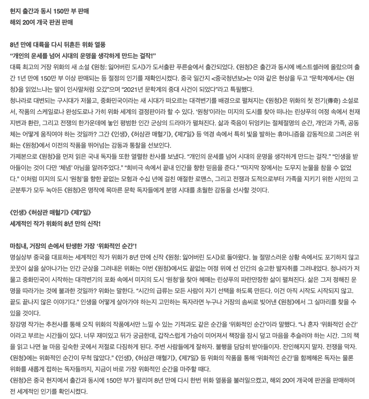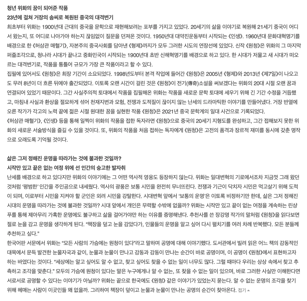 위화의 <원청>으로 예를 들어 설명해보겠다. 다음은 출판사 서평을 읽고 인지한 내용이다.