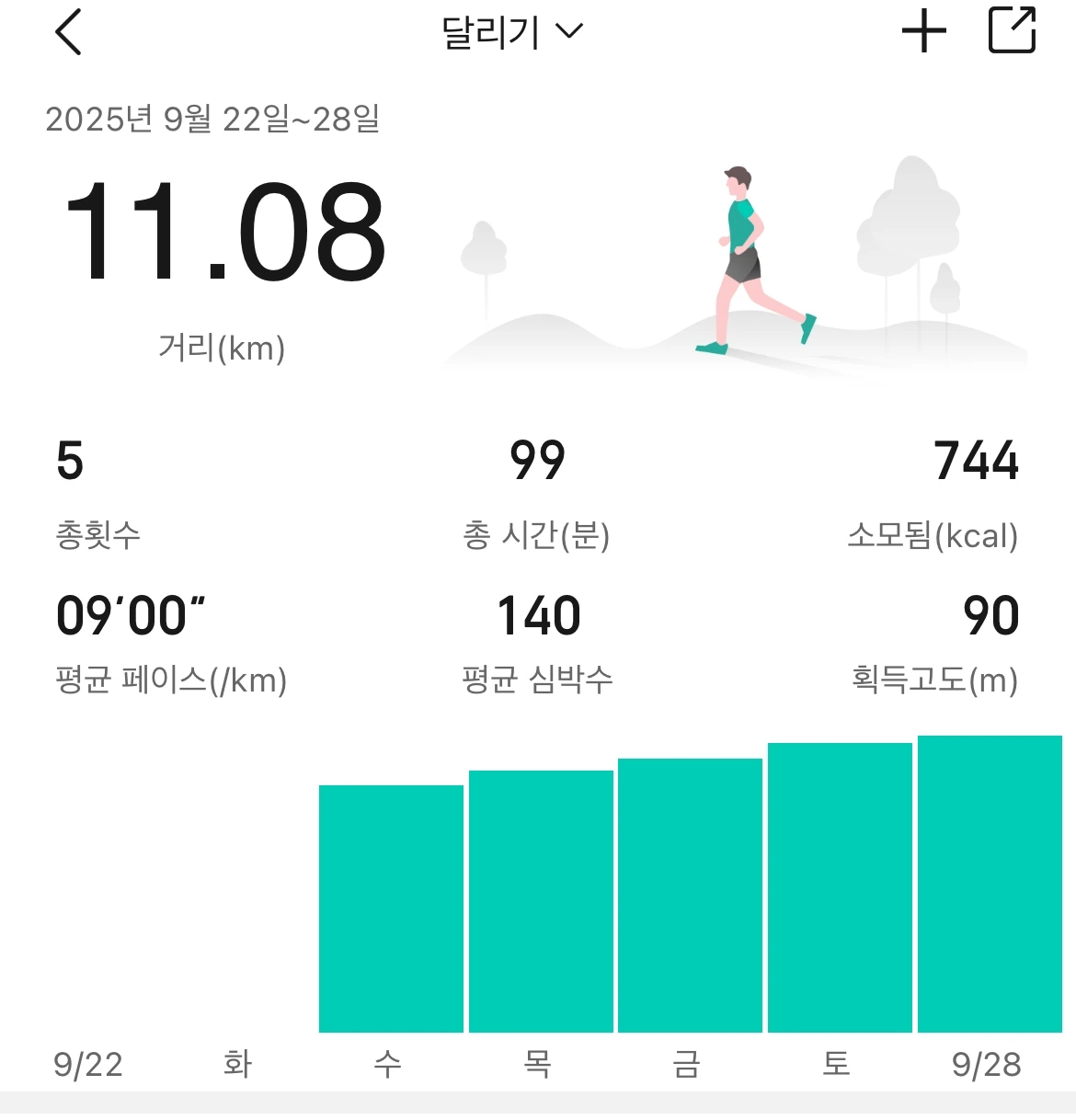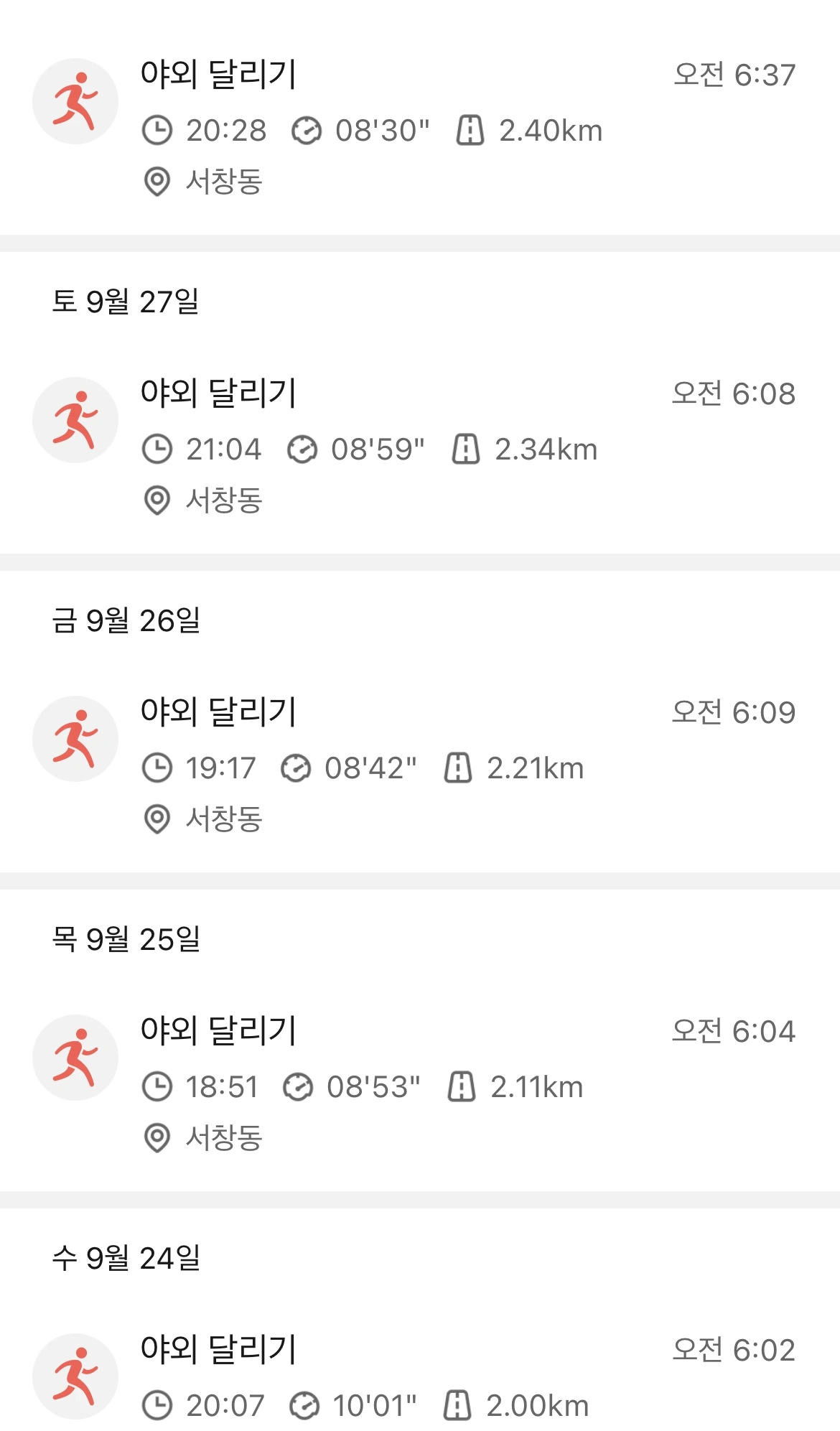 가볍게 달리고 있다. 매일 100미터 늘이는 것이 목표다. 수요일 새벽에 2키로에서 시작하여 오늘 2.4키로 달렸다. 8분대 기록, 꽤 괜찮다. 낮은 계단 모양의 도표도 꽤 근사하다.