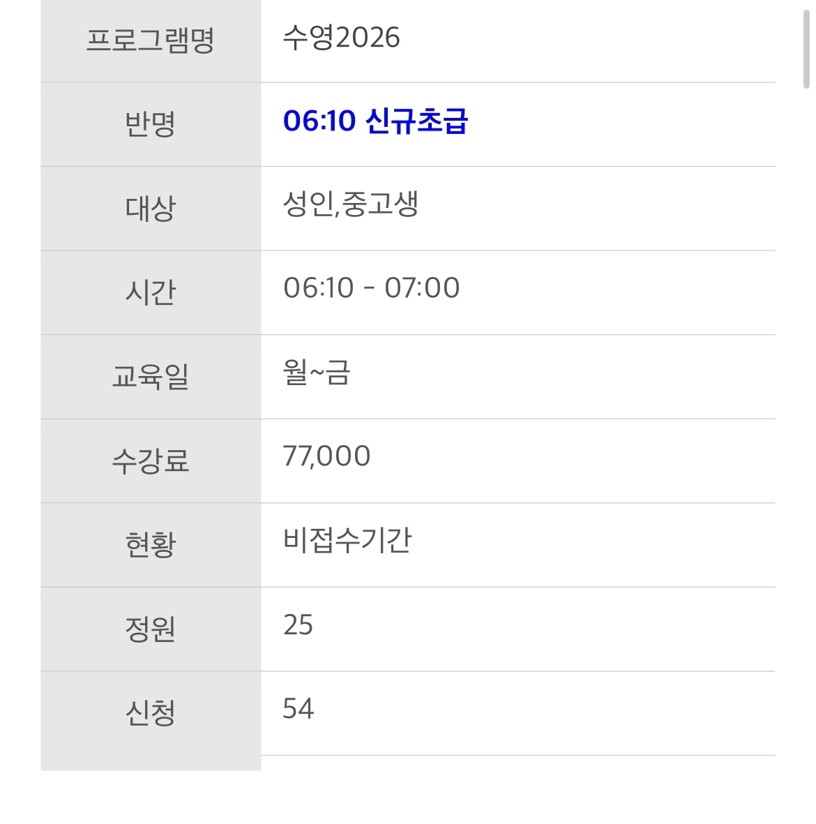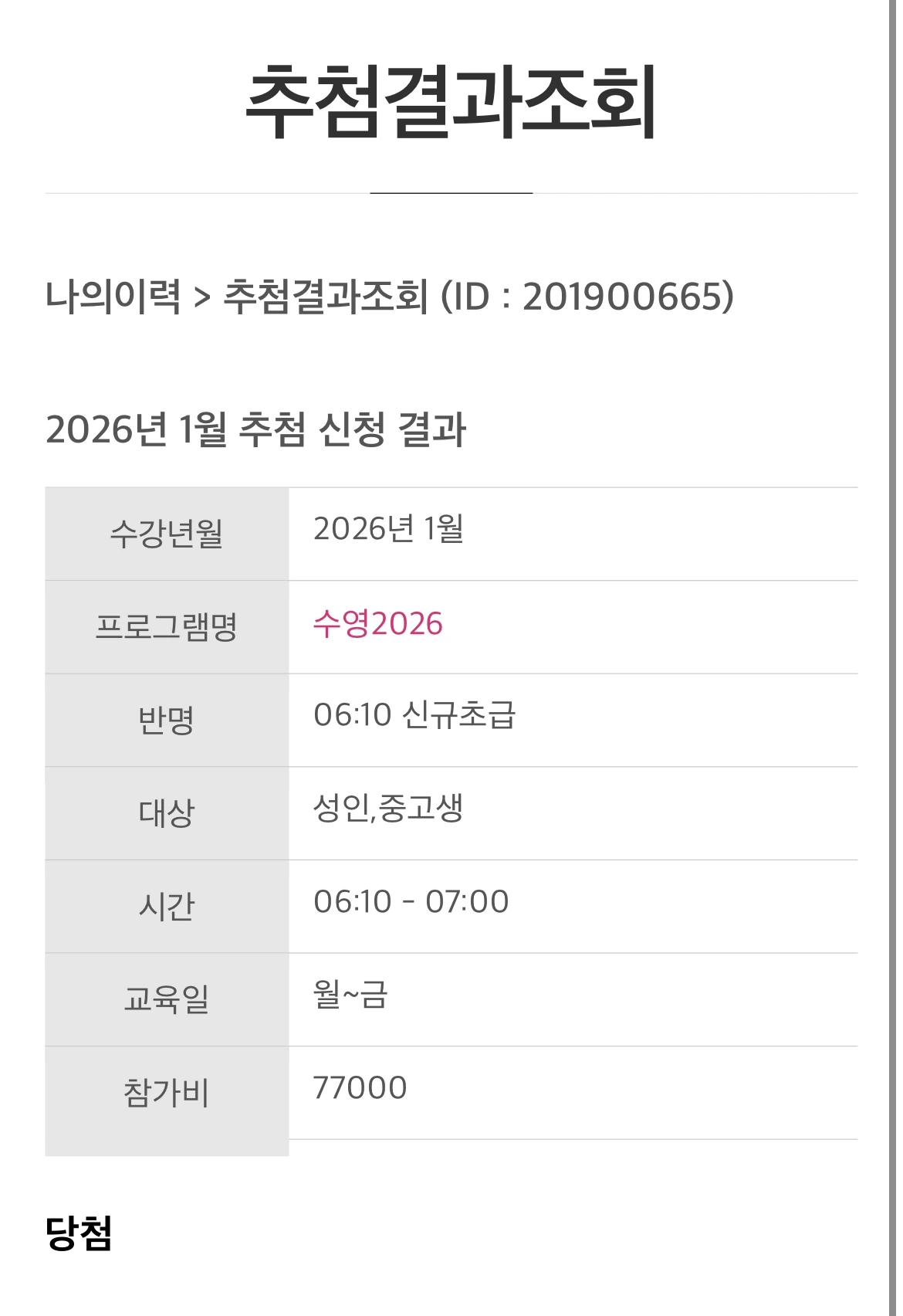 50명 넘는 신청자들 중에서 25명을 뽑는 수영수업에 드디어 당첨이 됐다. 1월-6월까지 체육문화센터 새벽 6시 수영반에 등록할 수 있게 되었다. 늘 떨어졌기 때문에 별로 기대를 안 했는데 '당첨'이라는 글자에 화들짝 놀라 나도 모르게 소리를 질렀다.