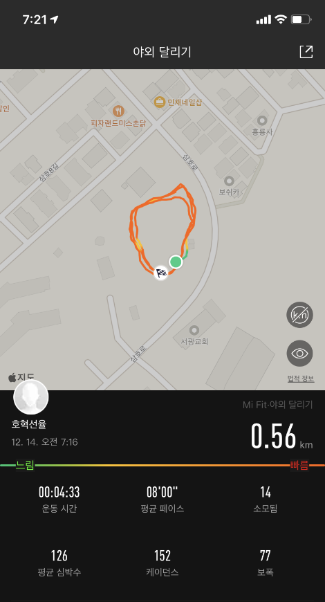 바깥 온도가 -2 였다. 옷을 챙겨 입고 나갔더니 어제보다 훨씬 추웠다. 늘 하던 대로 앱을 켜고 걷기를 측정했다. 공원에 오자마자 어제 보다 한 바퀴 더 뛰기로 각오하며 천천히 뛰었다. 겨우 평균 페이스 내로 4분 33초 세 바퀴 돌았다. 오늘 목표 달성이다. 이어폰에서는 제이어스 CCM 노래가 웅장하게 울린다. 스스로 자축하며 다시 걷기 모드로 바뀌어서 빠른 걸음으로 집으로 갔다.
