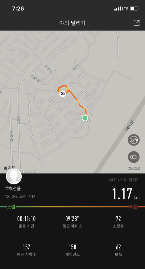 달리기 시작할 때 너무 느리게 달려서 평균 페이스가 8분 이내로 들어가야 하는데 넘어서버렸다. 너무 아쉬웠지만 숨이 차서 도저히 다시 뛸 수가 없었다. 여전히 달리기는 힘들다. 무리하지 말자. 내일 또 달리면 된다. 내일 기록 측정도 신경 쓰면서 달려보자. 10분 이상만 뛰면 된다.