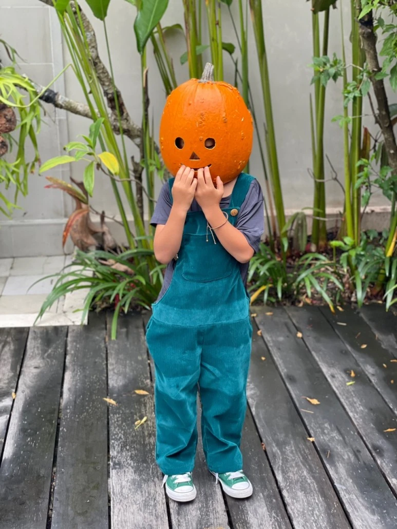 올해 핼러윈 분장은 ‘잭 오 랜턴’으로 정했다. 일단 선명한 오렌지색 유럽 호박을 찾아야 하는데 호박 찾는 것부터 난관이다. 발리의 늙은 호박은 한국 늙은 호박과 똑같다. 넓적하고 둥그런 누런색 호박이다. 스미냑과 꾸따에 있는 마트란 마트는 다 뒤졌지만 찾을 수가 없어 결국 어린이의 아빠가 사누르까지 다녀왔다. 핼러윈이 얼마 남지 않아서인지 남은 호박이 몇 덩이 없어서 고르고 골라 간신히 색이 곱고 어린이 머리통에 잘 맞을법한 사이즈의 호박을 구했다. 아빠가 호박을 구할동안 엄마와 이모는 코듀로이 오버롤을 만들기 위한 원단을 찾으러 다녔다. 사실 옷까지 만드는 건 계획에 없었는데 토코페디아 (인도네시아의 쿠팡 같은 인터넷 쇼핑 플랫폼)를 다 뒤져도 성에 차는 옷을 찾지 못한 친구가 핼러윈을 사흘 남기고 옷을 만들어버리겠다고 마음을 바꿔먹었다. 지쳐 떨어져 나간 이모를 두고 혼자 온 동네를 뒤져 마음에 쏙 드는 원단을 찾았다며 친구는 그날 밤부터 부지런히 바느질을 시작했다.