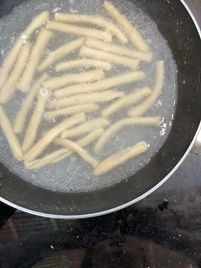 밀가루 500G과 물 적당량 (촉촉한 수제비 반죽을 만든다고 생각하고 물을 가감하는 것이 좋다), 소금, 후추, 기름을 한데 뭉쳐 치댄다. 많이 치댈수록 떡이 쫄깃하고 부드러워진다. 냉장고에서 하룻밤 휴지 시킨 반죽을 떡볶이 떡 모양으로 성형해 끓는 물에 넣어 익힌다. (15분에서 20분 사이) 밀가루떡은 의외로 오랜 시간 익혀야 한다.