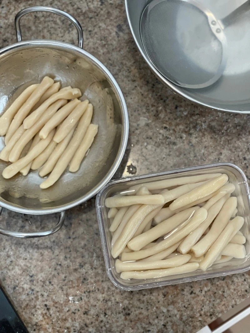 밀떡을 냉동실에 넣어두고 자려고 누워서도 얼마나 두근두근했는지 모른다. 내일이면 드디어 여기서 밀가루떡으로 만든 떡볶이를 먹을 수 있다. 그런데 고대하던 첫 번째 밀떡은 반만 익힌 밀가루 반죽을 먹는 맛이었다. 씹을 때마다 날밀가루 맛이 났고 쫄깃하지도 않았다. 짐작되는 몇 가지 요인을 보완해서 다시 만들어보기로 했다. 떡은 끓는 물에 최대한 오래 삶아야 했고 반죽에 물을 조금 더 넣어 더 촉촉한 밀가루 반죽을 만들었어야 했다. 그리고 기름을 좀 더 넣어야 했다.