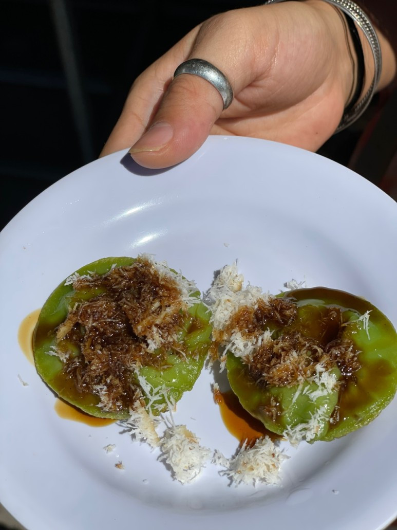 지나는 길에 귀여운 아궁이가 있어서 멈췄다. 판단을 섞은 반죽에 시럽을 뿌리고 코코넛을 올린 발리의 간식이다. 6개 들이 한 팩에 10K (800원)이다. 작고 동그란 모양이 화전을 연상시킨다. 떡처럼 쫄깃쫄깃하고 달콤한 시럽에 코코넛 가루가 아삭아삭 씹힌다. 금방 꺼내 따끈따끈할 때에는 맛있었는데 몇 시간 지나고 나니까 맛이 뚝 떨어졌다. 그리고 정말 달다. 식으니까 더 달다. 발리 사람들은 정말 단 것을 좋아한다. 판단은 식재료로 많이 쓰이는 잎이다. 제과점에 가도 판단을 이용한 케이크류가 많다. 고운 초록빛을 낼 수 있어서 언젠가 판단을 이용해서 베이킹을 해보고 싶다.