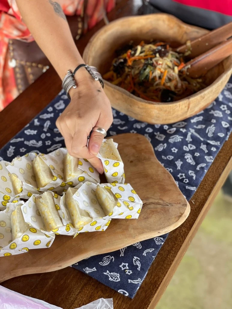 슬슬 출출해져서 각자 준비해온 음식들을 테이블에 올렸다. 우리는 달걀 샌드위치와 잡채를 준비해 갔다. 외국인들이 잡채에 흥미를 보인다. 채소가 많이 들어간 건강식이라고 했다. 잡채라고 하면 잔치음식이라고만 생각했는데 채식주의자들이 감탄을 하니까 잡채가 특별한 음식이 된 느낌이다.