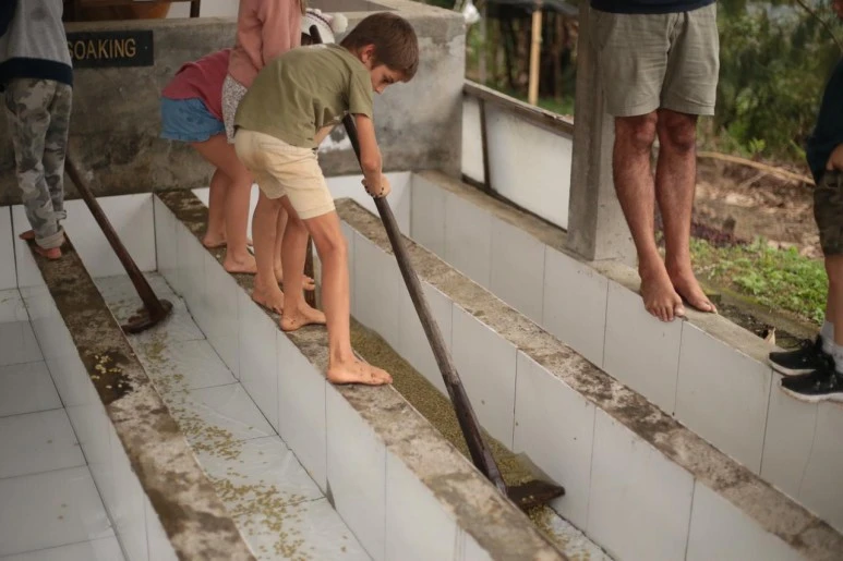 수확한 커피 열매를 씻었다. 이제 커피 열매를 말리러 갈 차례다. 커다란 비닐하우스 같은 곳에서 어마어마한 양의 커피 열매를 말리고 있다. 냄새가 고약해서 5분도 못 버티고 뛰쳐나왔다. 어린이들의 하루가 엄청 바쁘다. 열매를 커피로 만들기까지의 전 공정을 체험하는 동시에 열심히 놀고 있다. 트럭 타고 동네 한 바퀴, 해먹에 매달렸다 뛰어내리기, 널빤지 위에서 스케이트보드 타기 등등 친구들과 함께 신나게 노는 것을 보며 왜 사람들이 발리에서 애를 키우고 싶어 하는지 어렴풋이 알 것도 같았다.