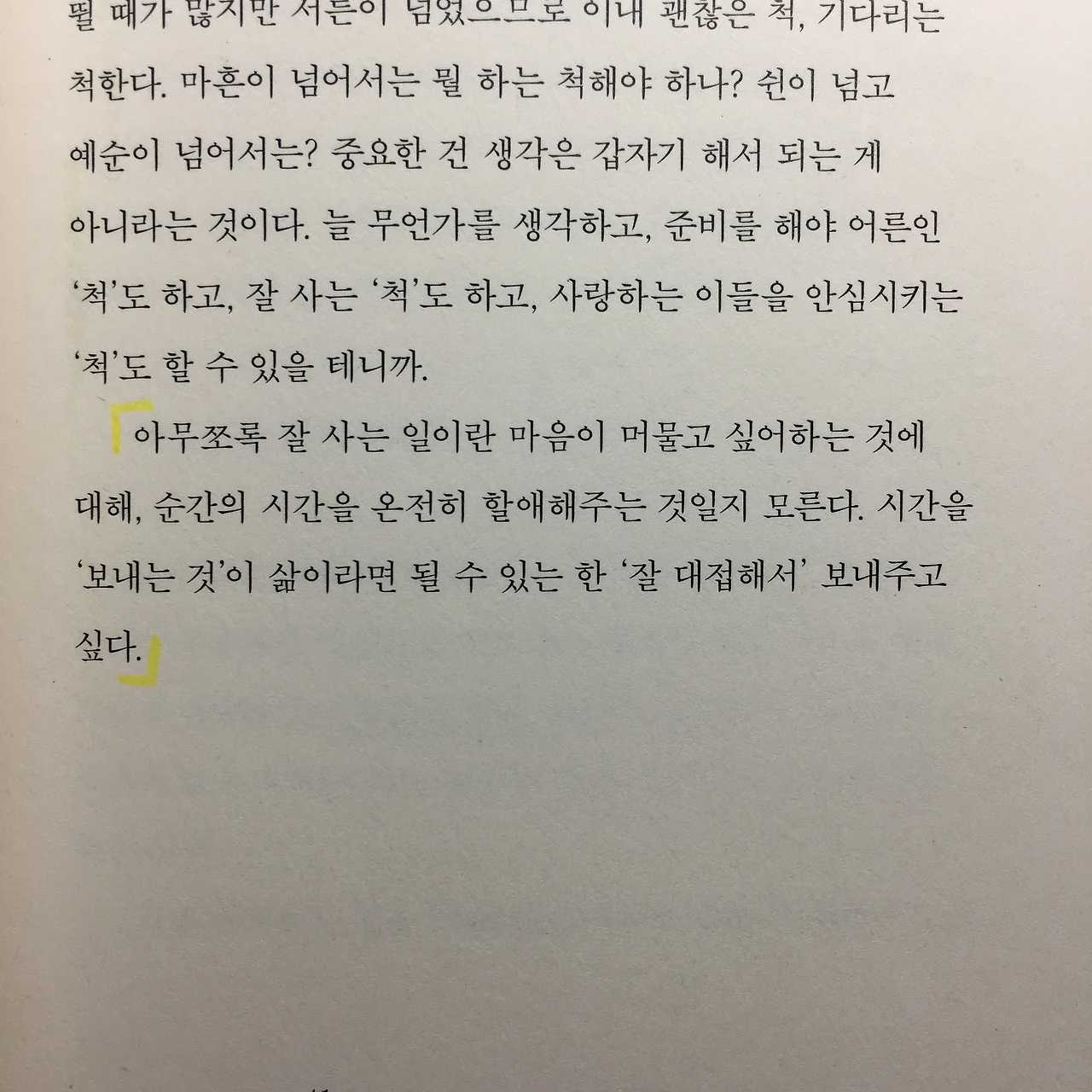 아무쪼록 잘 사는 일이란 마음이 머물고 싶어 하는 것에 대해, 순간의 시간을 온전히 할애해주는 것일지도 모른다. 시간을 '보내는 것'이 삶이라면 될 수 있는 한 '잘 대접해서' 보내주고 싶다. [소란]中
