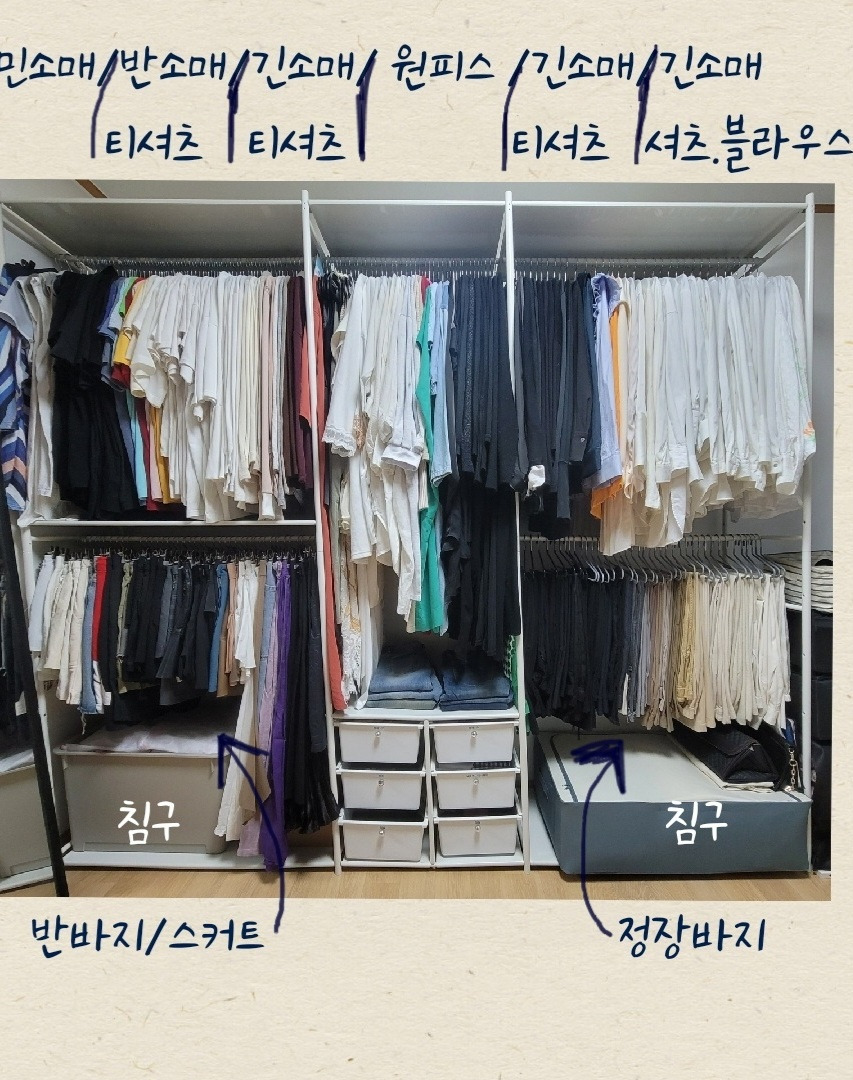 단정한 옷으로 시각적인 만족을 주면서 기준점을 세웠으면 좌우에 계절이나 용도를 고려해서 다른 옷들을 자리 잡아 준다면 사용하기에도 유지하기에도 편리할 것이다.