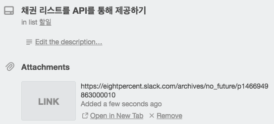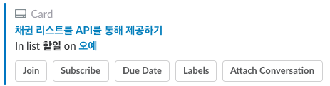 5. 사람들이 슬랙 채널에서 할 일에 대한 이야기를 나눈다. "채권 리스트를 API를 통해 제공하면 좋겠다"라는 주제로 이야기가 진행되어 개발하기로 결정했다.