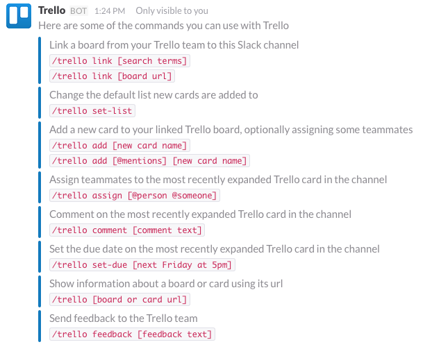 계정을 연결한 후 "/trello help" 명령을 입력해 보면 다음과 같은 기능들을 볼 수 있다.