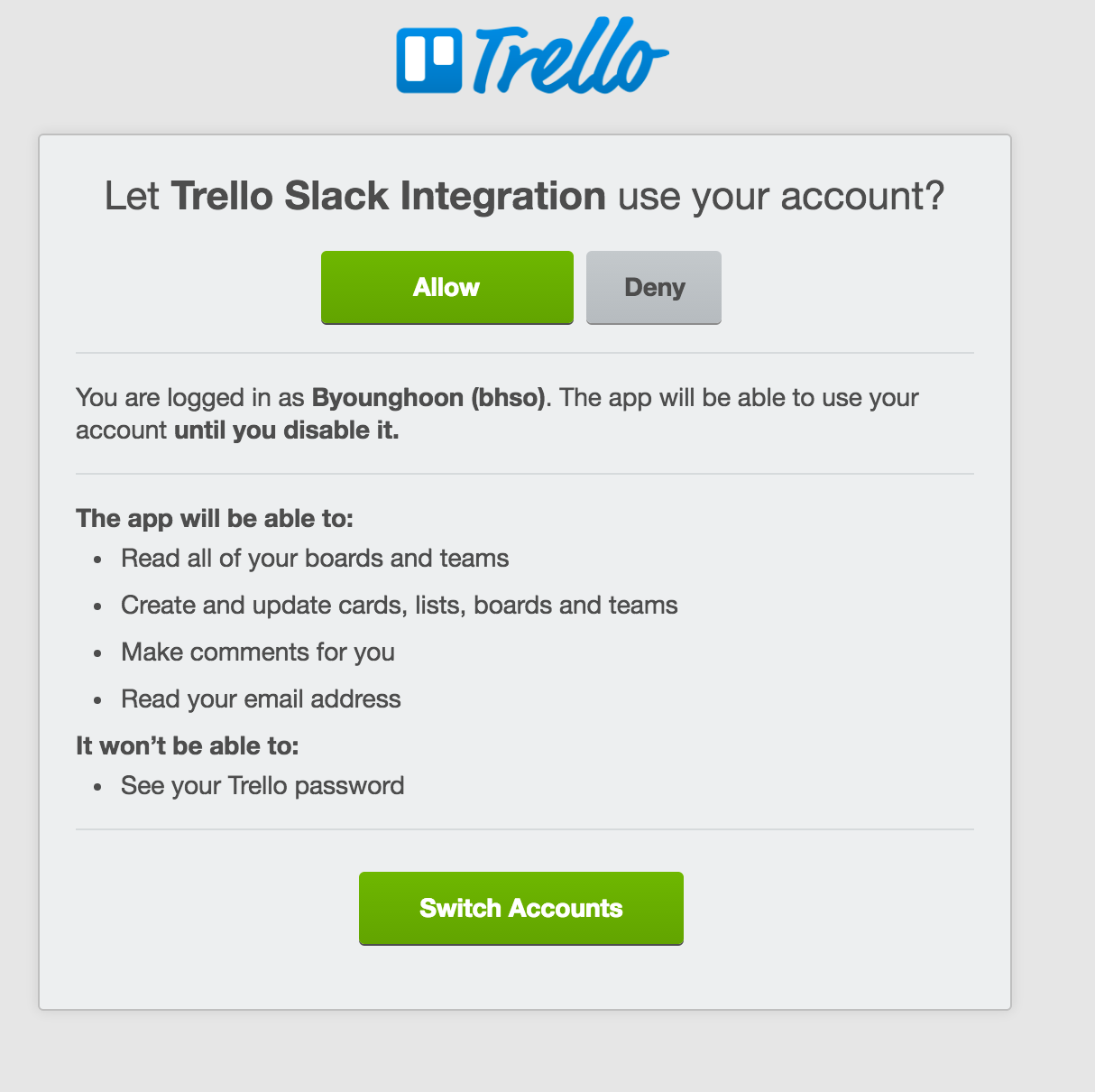 당장 사용해보기로 했다. 최초로 "/trello" 명령을 사용하면 슬랙과 트렐로의 계정을 연결하게 된다.
