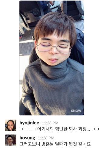 며칠 간은 아침 데일리 미팅이 왠지 허전하고, 슬랙으로 말을 걸면 대답을 할 것만 같았다. 하지만 또 새로운 사람이 회사에 들어오고 바쁘게 회사가 돌아가면서 금방 잊혀지긴 하더라. 아 그러고 보니 병훈님이 만든 코드에서 버그가 나올 때마다 우리는 회사에 남은 아기새 인형을 괴롭히긴 했다.