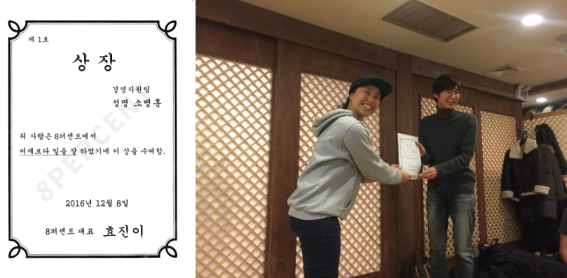 수많은 스타트업 중에서 왜 에잇퍼센트를 선택했다고 물으신다면, 빠른 속도로 성장하면서 변하고 있는 스타트업 속에서 일해보기를 원했기 때문이다. 그리고 당시의 나는 CTO의 멋진 말 한마디에 눈을 반짝이며 '이 회사에서 이 사람과 일하고 싶다'라고 생각하면 앞뒤 안 가리고 지원하는 이상주의자였다. 그래서 페이스북에서 호성님의 글을 읽고 '이 회사가 내가 생각하던 회사구나'라는 생각이 들어서 먼저 지원했던 회사를 포기하고, 에잇퍼센트 입사를 간절히(?) 원하게 되었다.