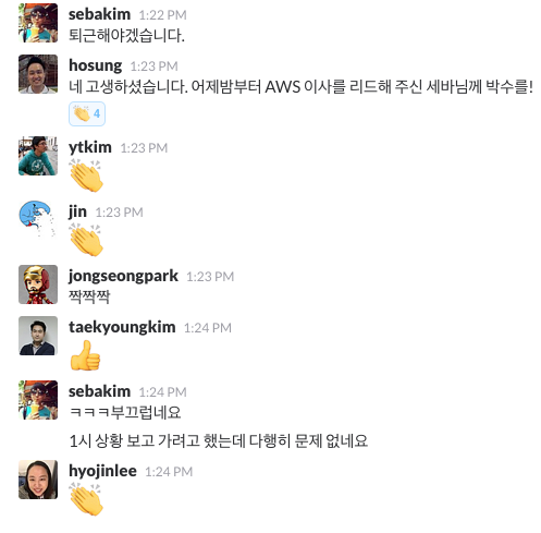 아침에 일어나서 슬랙을 확인했다. 슬랙에 별다른 멘트가 없는 것을 보니 큰 문제는 없나 보다. 야호! 이전된 서버가 정상적으로 운영되고 있는지 확인을 위해 심사팀도 일찍부터 출근해서 테스트를 진행하고 있었다. 회사에 도착해 보니, 나를 제외하고는 모두 밤을 새워 일을 하고 계셨다. 다들 몽롱한 표정이다. 고맙다.