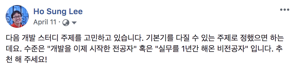 회사에서 스터디를 두 개를 마쳤고, 이번이 세 번째 스터디였다. 두숟갈(Django), 거울아거울아(데이터분석) 스터디까지 진행하면서 실전을 다루는 공부를 하다 보니 이번에는 좀 더 기본에 대한 공부를 하고 싶었다. 그래서 페이스북에 올려 보았다.