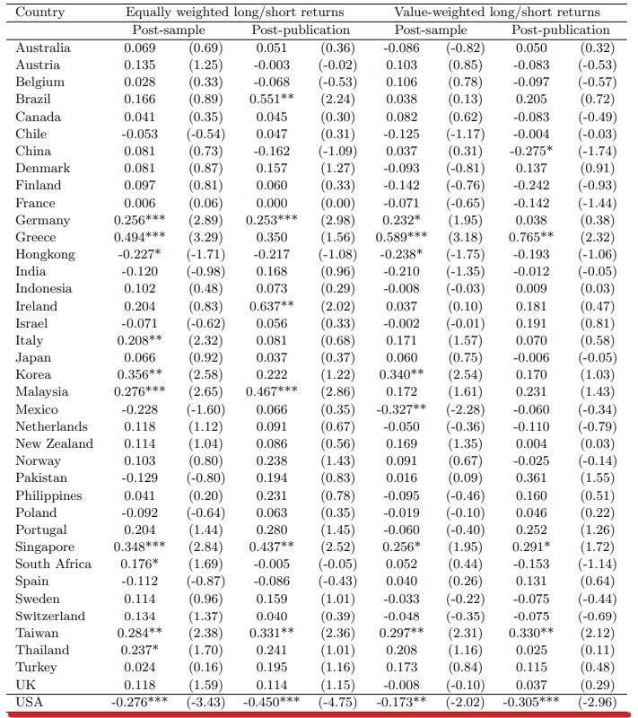 논문이 발표되고 난 후 롱숏 전략 동일가중 수익률(Equally weighted long/short returns), 롱숏 전략 시간가중 수익률(Vallue-weighted long/short returns)의 Post-Publication이 유의미하게 감소한 국가는 미국밖에 없다. 미국만이 이런 유의미한 알파의 상실이 나타난 이유는 다음과 같다. 미국에는 수천 개의 헤지펀드가 존재하고, 전반적인 금융 수준이 높기에 시장의 피드백이 상당히 빠르기 때문이다. 미국을 제외한 선진국 UK를 보았을 때, 논문이 등장하고, 오히려 동일한 알파 전략에 대한 시간가중 수익률은 상승한 것을 볼 수 있다.