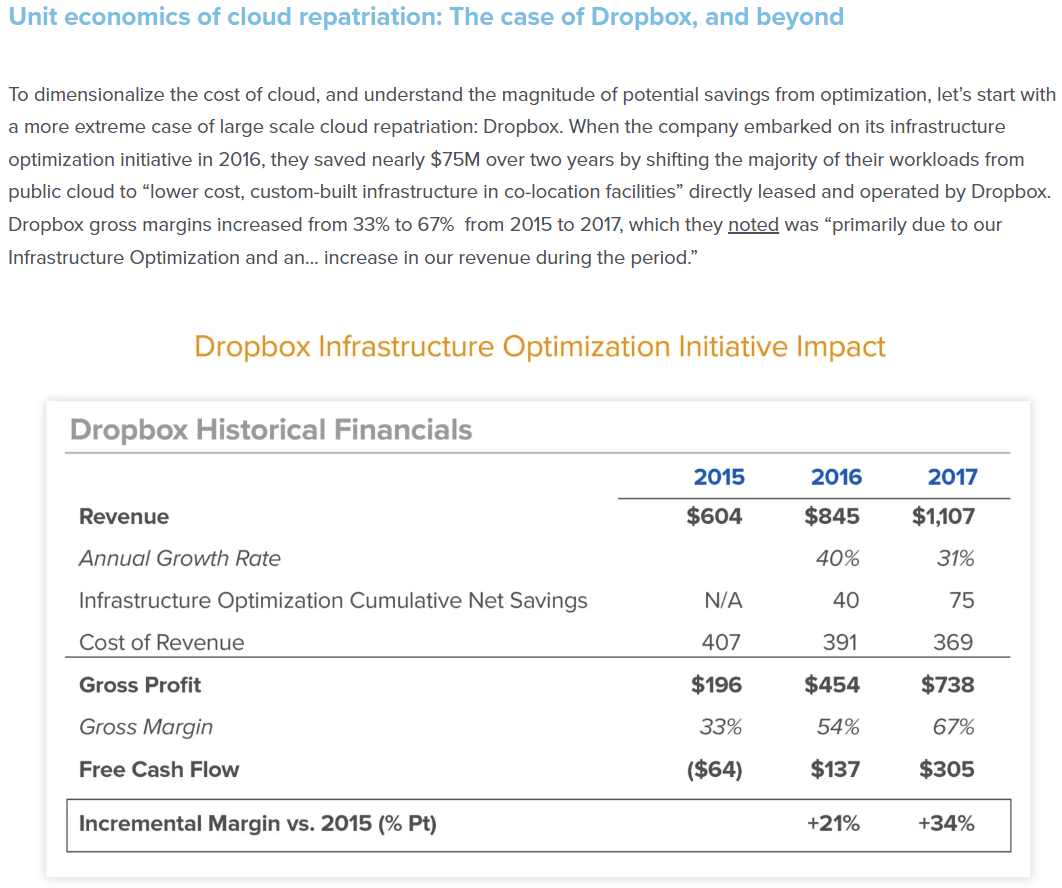 안드레센 호로위츠라는 벤처캐피털에서 발행한 'The Cost of Cloud, a Trillion Dollar Paradox' 리포트에 따르면, "클라우드는 스타트업의 초기에는 분명히 자본 절감 효과가 있지만, 기업의 성장성이 둔화되는 중후반부의 사이클로 진행됨에 따라 클라우드 비용은 수익성을 약화시키고, 시가총액 증가에 압박을 가한다."라고 주장한다. Dropbox를 예시로 보자.