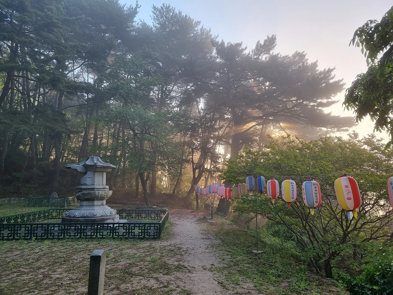 새벽녘, 안개가 자욱한 산길을 따라 작은 사찰로 향했다.