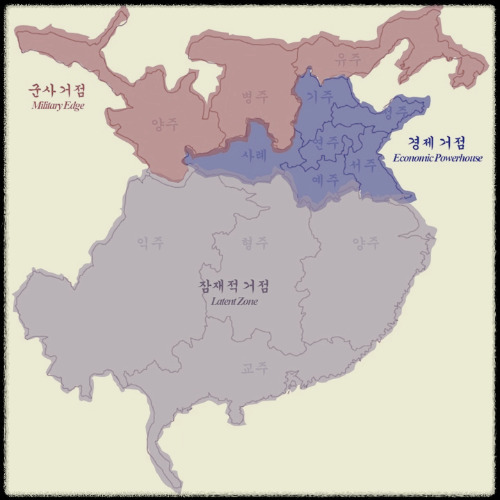 당시 중국 대륙의 지리적 여건이라는 하드웨어적 특성은 제국 시스템을 남부와 서부로 확장하는 데 필요한 비용을 상승시켰으며, 이에 따른 저조한 투자 대비 효율로 인해 남서부에는 제국 시스템의 기본설계, 즉 주 단위 행정구역 구분만이 적용되었습니다. 그리고, 각 행정구역 내에서는 지방세력들이 낙양 조정의 운영체제 기능을 대신하며 견고한 지방권력을 형성하게 됩니다. 중원과 남서부간 운영체제의 차이점은 당시 제국 시스템의 작동에는 큰 영향을 주는 요인은 아니었지만, 이후 역사의 흐름에 큰 영향을 주는 변수로 작용하게 됩니다.