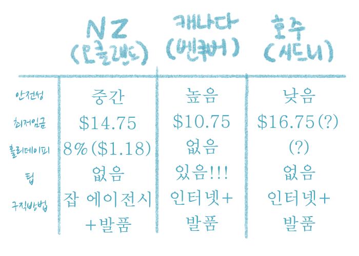 뉴질랜드, 호주, 캐나다 3개국을 적당히 비교해 보았습니다.