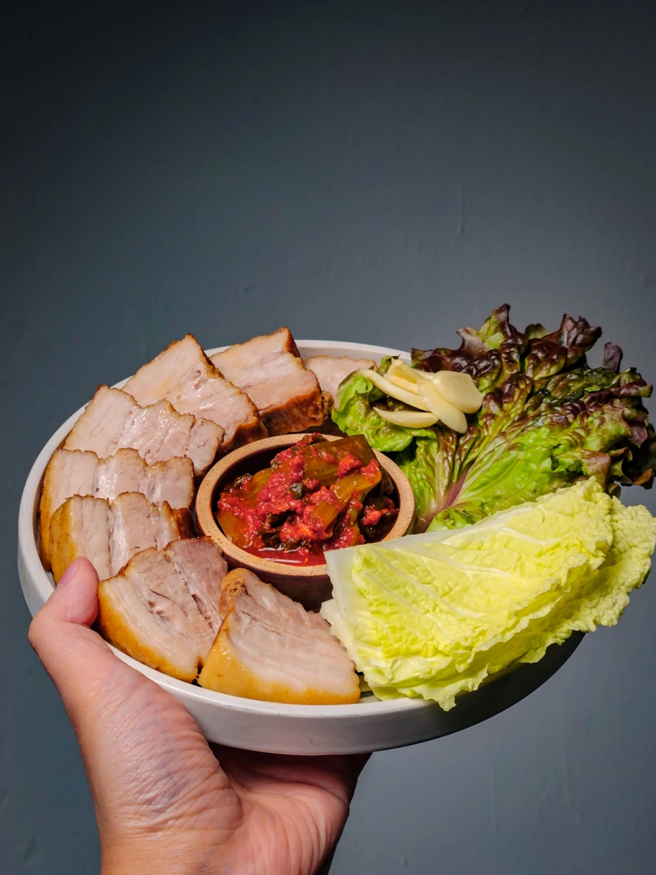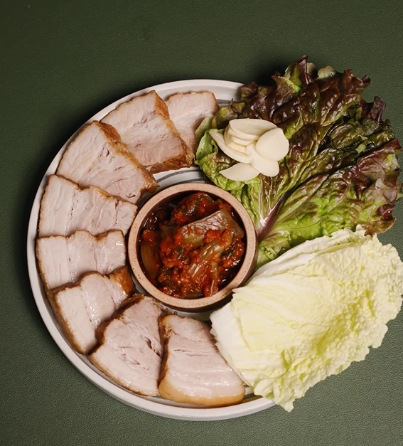 다 썰고 나면 쌈 재료와 김치 등을 같이 담아주면 돼요. 어때요? 참 간편하지 않나요? 비주얼도 괜찮고요.