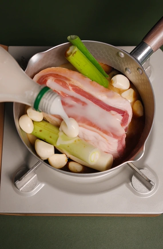 육식맨님의 레시피는 4가지 보쌈 사이에서의 공정성을 위해(?) 매우 심플했어요. 삼겹살 1근 (600g), 대파 한 단, 마늘 한 줌 (10알), 막걸리 1병 (750ml), 진간장 (187.5ml)을 그저 냄비에 한 번에 넣고 삶으면 되는 것뿐이었죠. 진간장은 막걸리의 1/4 용량만 넣으시며 되며, 계량을 할 땐 사용한 막걸리 병을 고스란히 재사용하면 돼요.