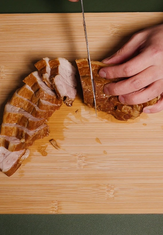 그럼 이렇게 먹음직스러운 돼지고기가 되는데, 꺼낸 후에 바로 썰지 않고 10분 정도 식힌 다음 썰어주면 모양도 예쁘게 잘 유지된 채 썰립니다.