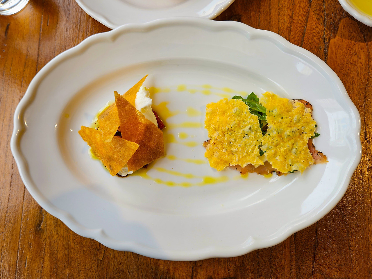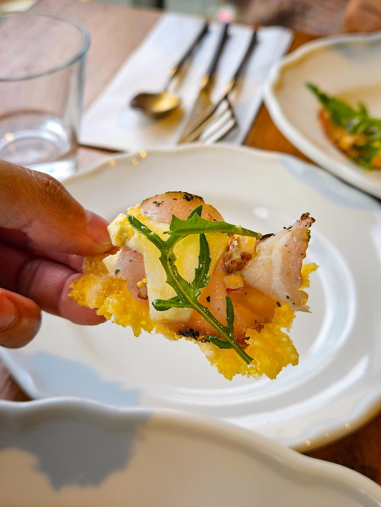 카프레제 반대편에는 파스트라미와 사과, 루콜라, 치즈튀일이 층층이 쌓여있는 형태를 갖춘 음식이 놓여 있습니다. 먹는 방법으로는 함께 싸서 다 같이 먹는 것을 추천해 주셨는데, 한 입 먹어보니 알싸하면서도 씁쓸한 맛들이 무척 오묘하게 느껴졌습니다. 애피타이저 한 접시에 짠맛, 단맛, 고소한 맛, 신맛 등 맛은 물론 부드럽고, 바삭하고 등 다양한 식감까지 담겨 있어서 본 음식에 들어가기 전에 모든 미각세포를 깨워주는 것만 같은 요리였습니다.