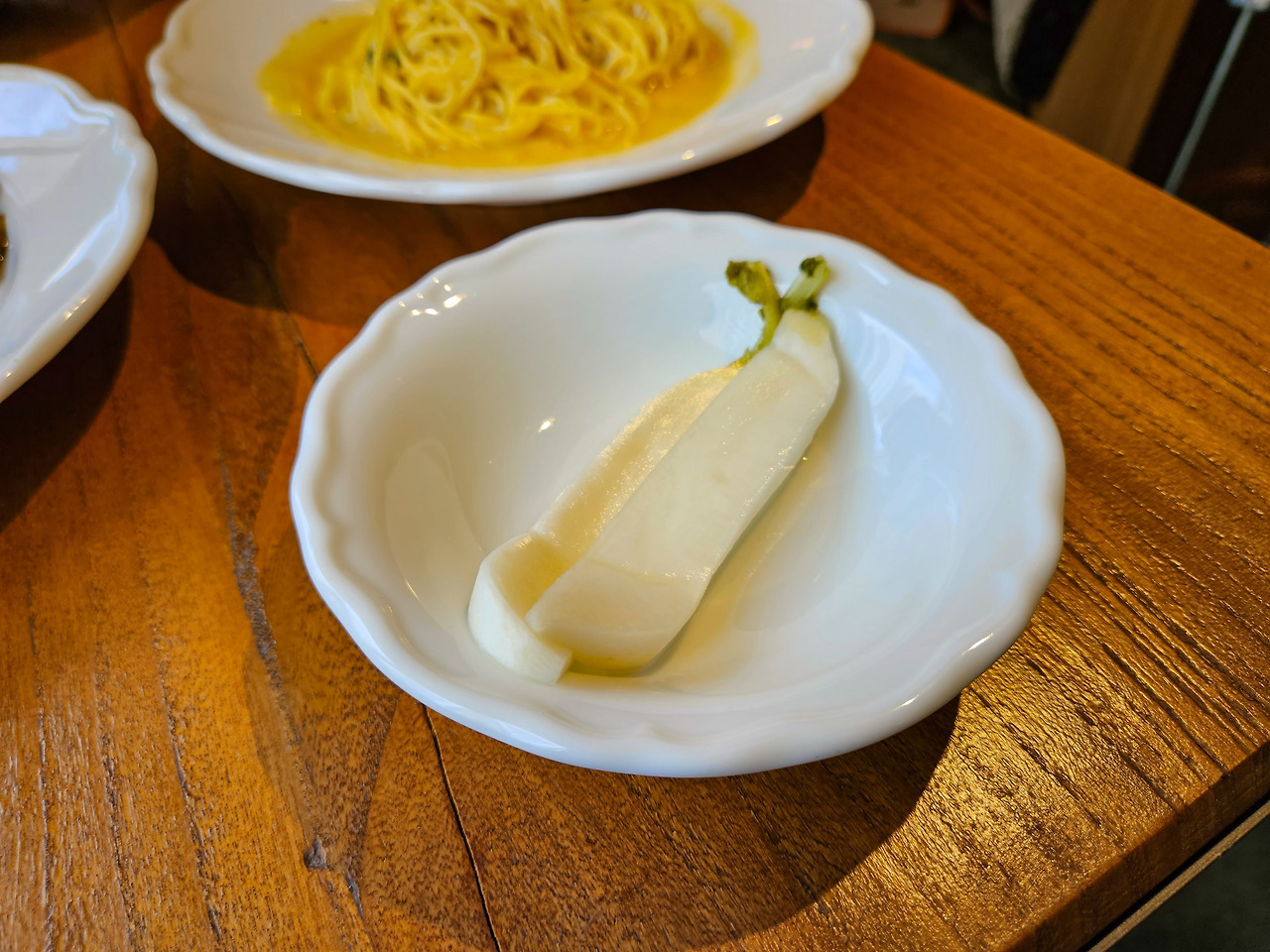 느끼할 때쯤엔 파스타와 함께 나온 알타리 피클을 먹으면 좋습니다. 아삭한 식감에 적당하게 갖춘 시트러스 풍미가 정말 일품입니다.