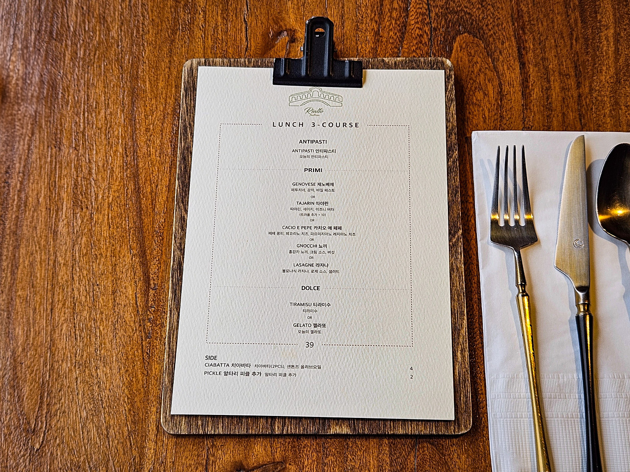 점심시간에는 코스 주문만이 가능하며 코스는 3코스로 구성되어 있습니다. 그중 메인메뉴는 제노베제, 따야린, 카치오 에 페페, 뇨끼, 라자냐 중에서 고르면 되고, 디저트는 티라미수와 젤라또 중에서 고르면 됩니다.