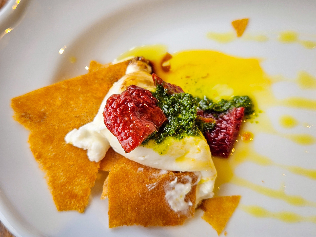 처음으로 먹은 건 카프레제였습니다. 썬 드라이드 토마토와 바질 페스토, 브리타 치즈, 튀일로 구성되어 있으며 감칠맛 넘치는 토마토의 새콤달콤한 맛과 부드럽게 씹히는 브리타 치즈가 매력적입니다.